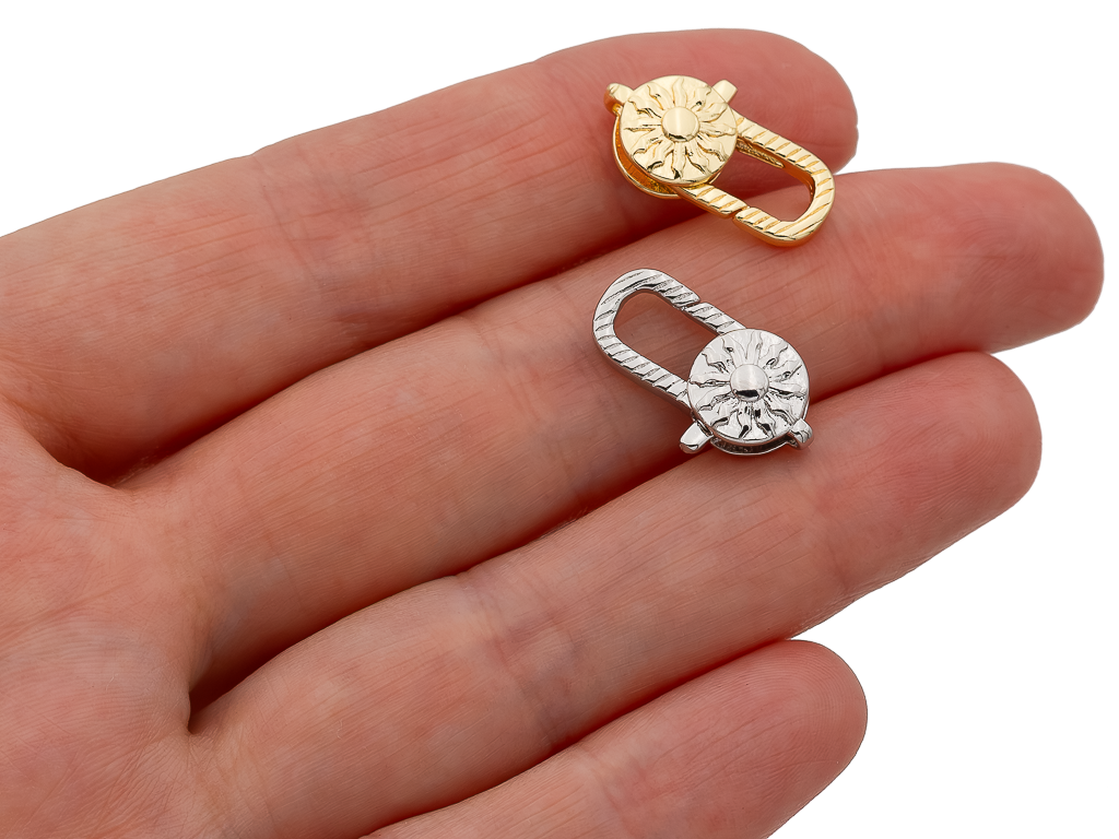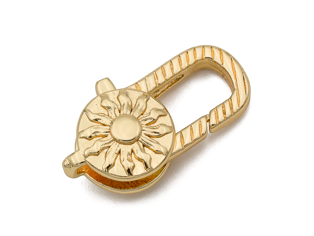 Среднего размера карабин с узорами в виде солнышка отлично подойдет для крупной цепочки, шнура.