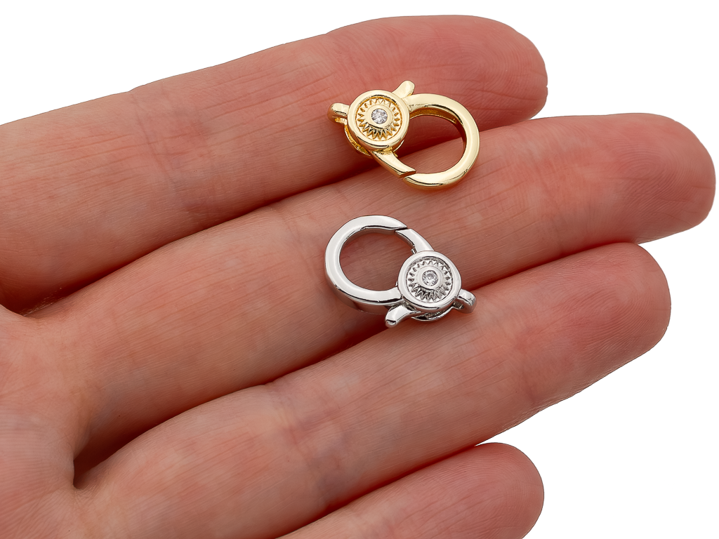 Среднего размера карабин с узором и прозрачными стразами отлично подойдет для крупной цепочки, шнура, также может стать самостоятельным декоративным элементом в колье.