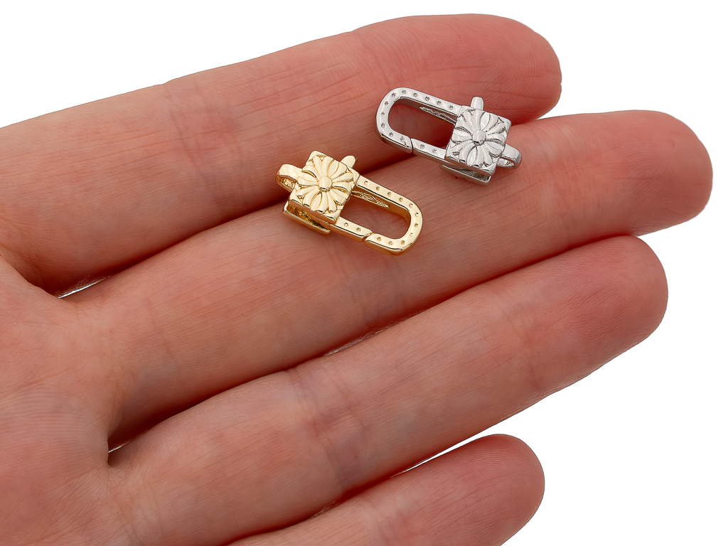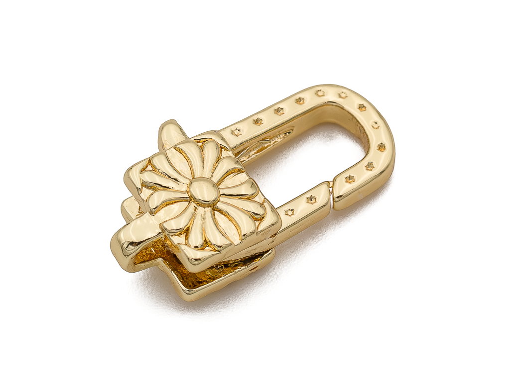 Среднего размера карабин с узором в виде цветка отлично подойдет для создания любых украшений- колье, чокера, браслета. Также может стать декоративным элементом.
