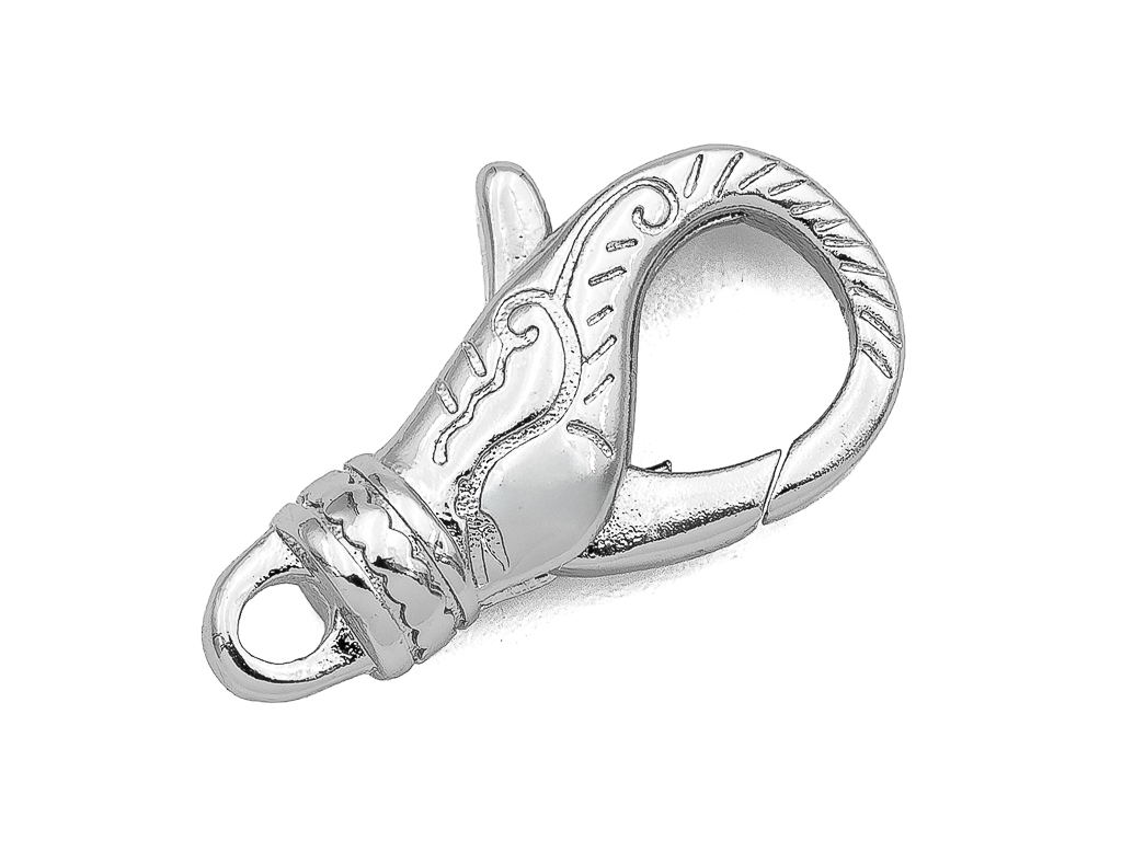 Среднего размера карабин с узором (без поворотного механизма) отлично подойдет для крупной цепочки, шнура, также может стать самостоятельным декоративным элементом в колье.