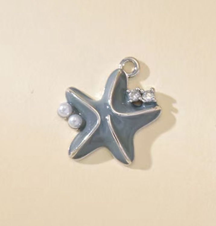 Небольшая подвеска в форме морской звезды с эмалью, прозрачными стразами и бусинами-имитацией жемчуга хорошо будет смотреться на браслете, колье, чокере, серьгах.