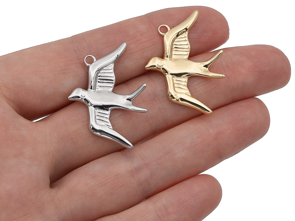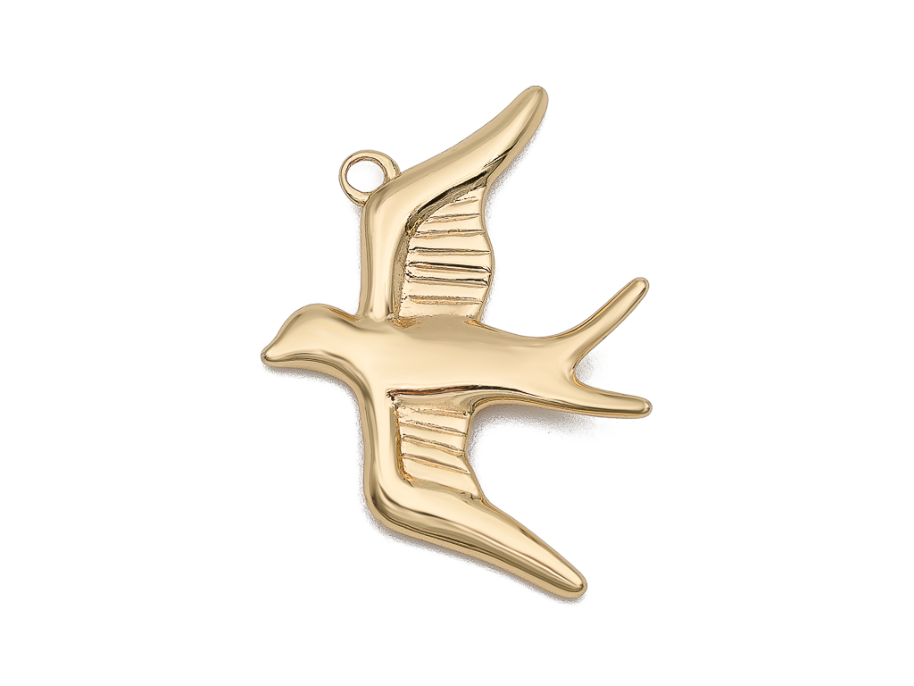 Стильная подвеска в форме летящей ласточки станет настоящей находкой для любителей эксклюзивных украшений. Отлично будет смотреться на чокере или колье из натуральных камней или жемчуга, а также может стать самостоятельным кулоном на простой цепочке. Такая подвеска придаст образу легкости и мечтательности.