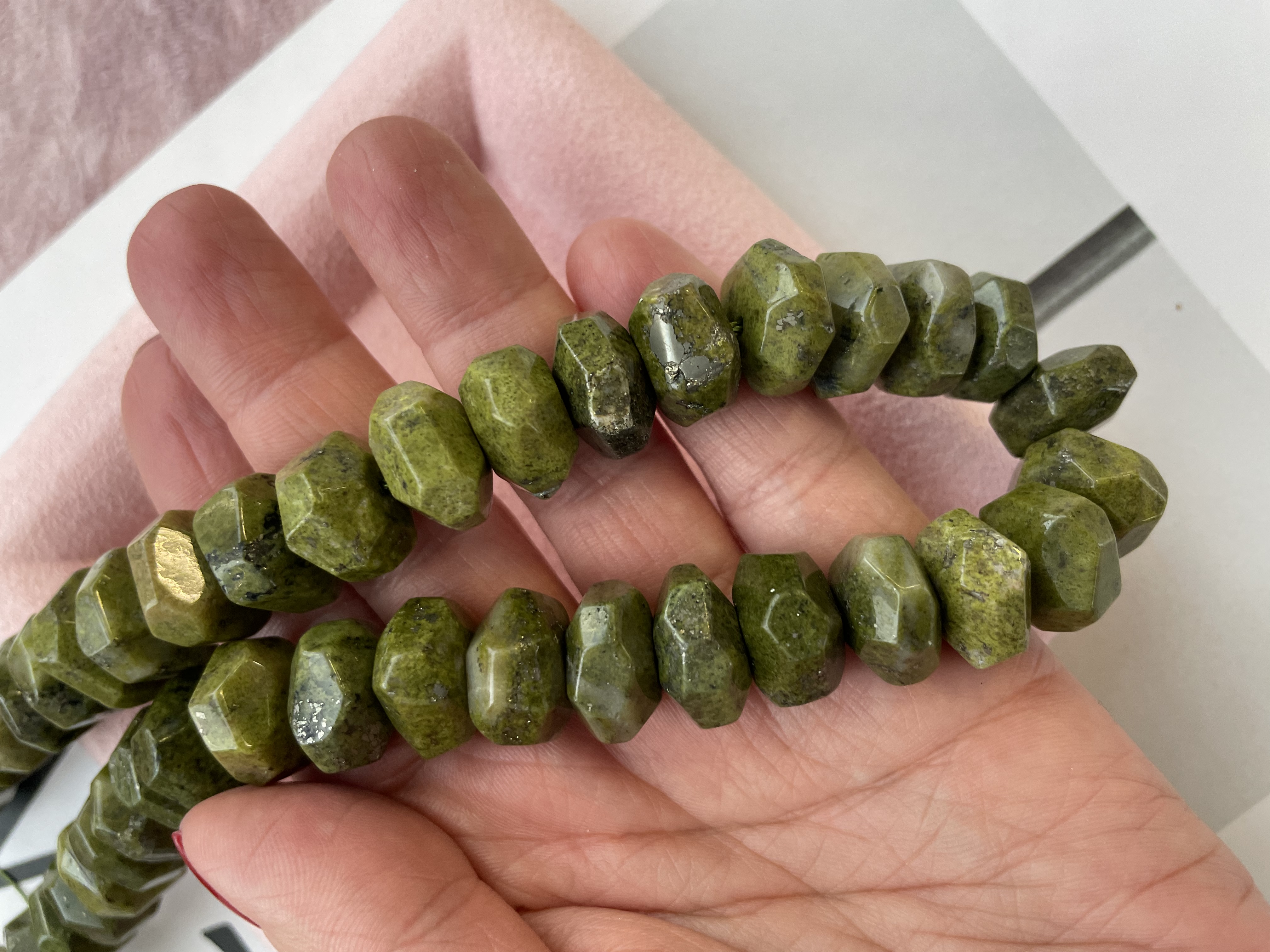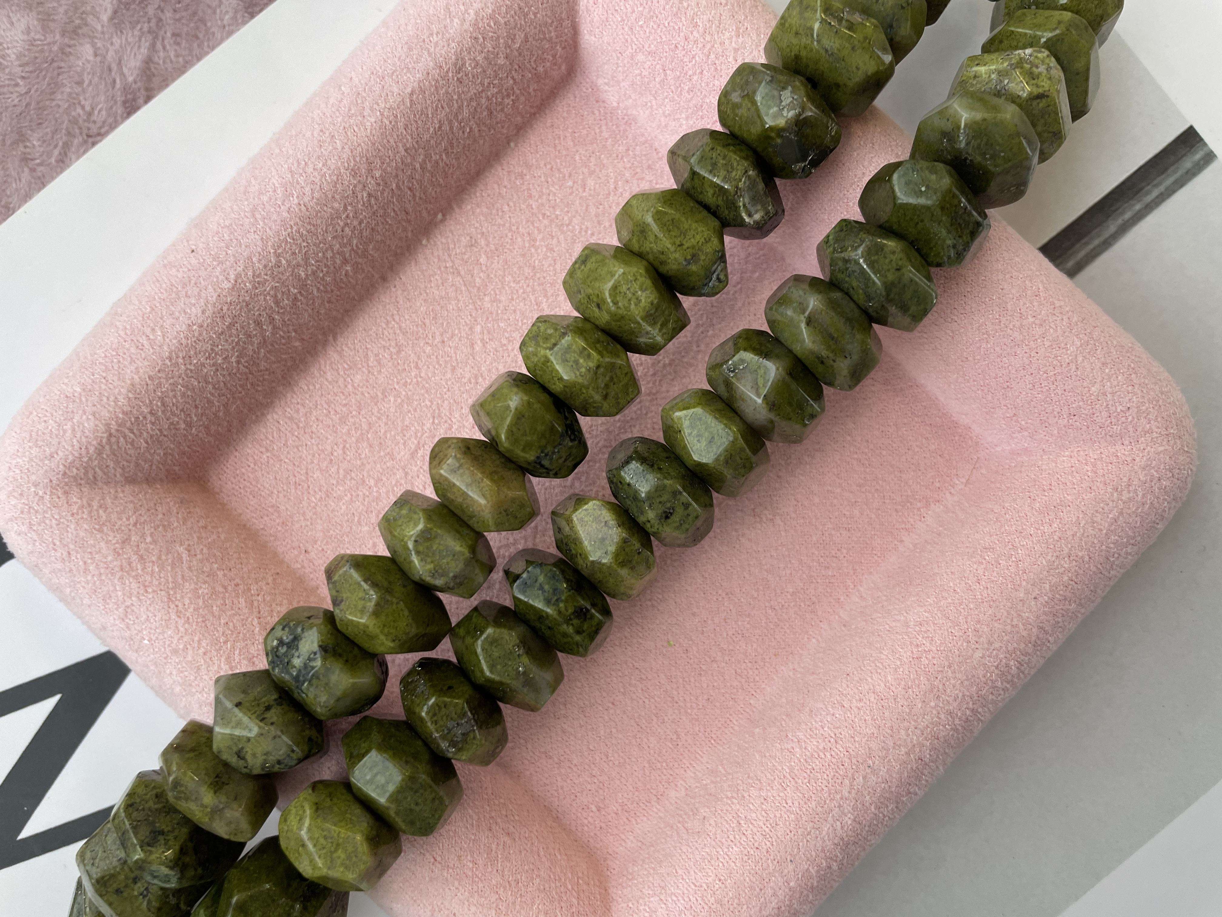 Бусины из нефрита в форме ронделя с крупной огранкой можно использовать для любых видов украшений, идеально подойдут для браслета, колье, чокера, сережек. Камни в нитке неоднородны, отличаются по цвету и размеру.