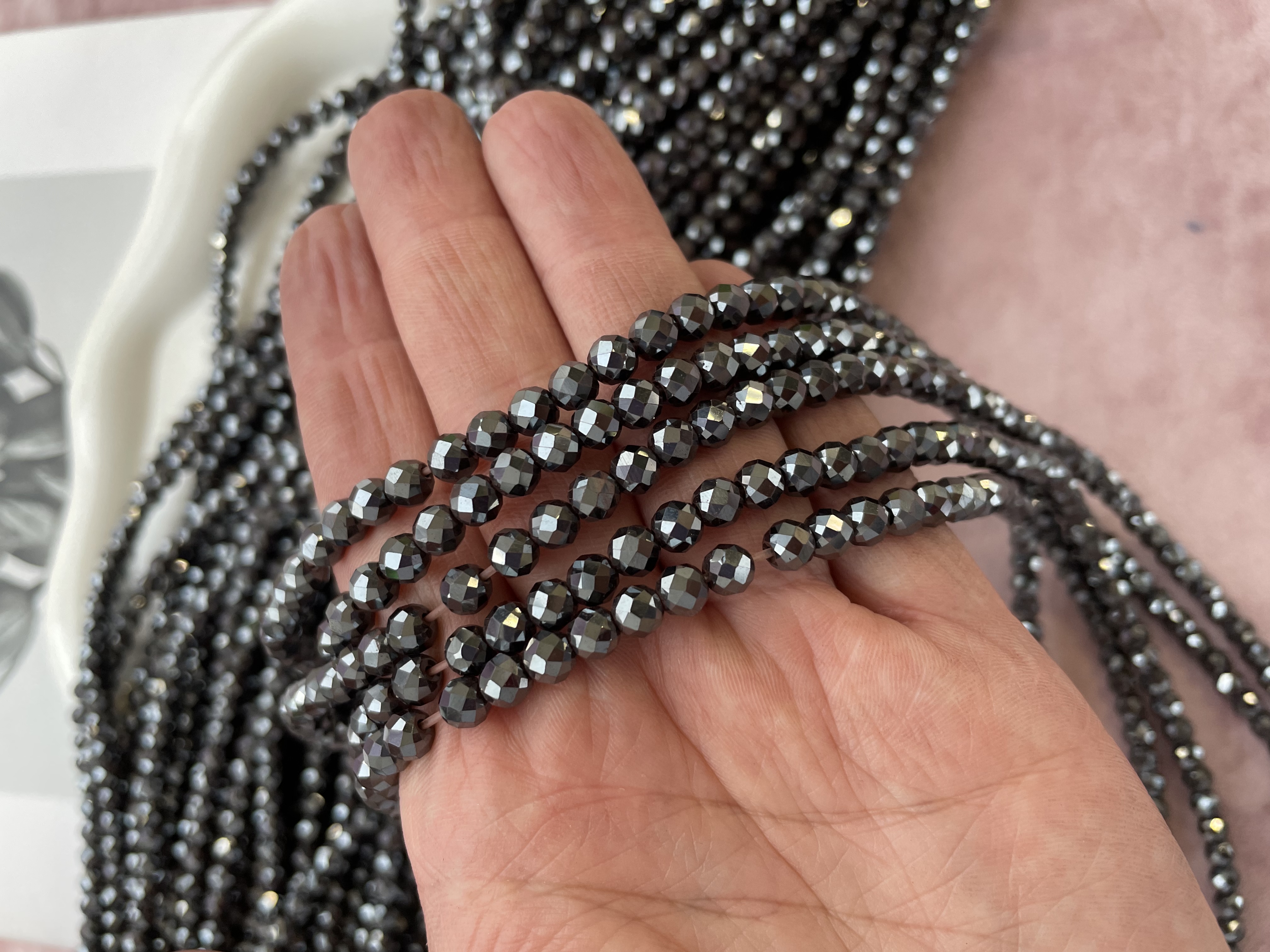 Бусины из гематита используют для создания любых видов украшений, идеально подойдет для браслета, колье, чокера, сережек, могут быть использованы как разделители между бусинами в украшении. Бусины из гематита круглой формы, ювелирной огранки с покрытием. Камни в нитке неоднородны, могут незначительно отличаются по цвету и размеру, не магнитятся.