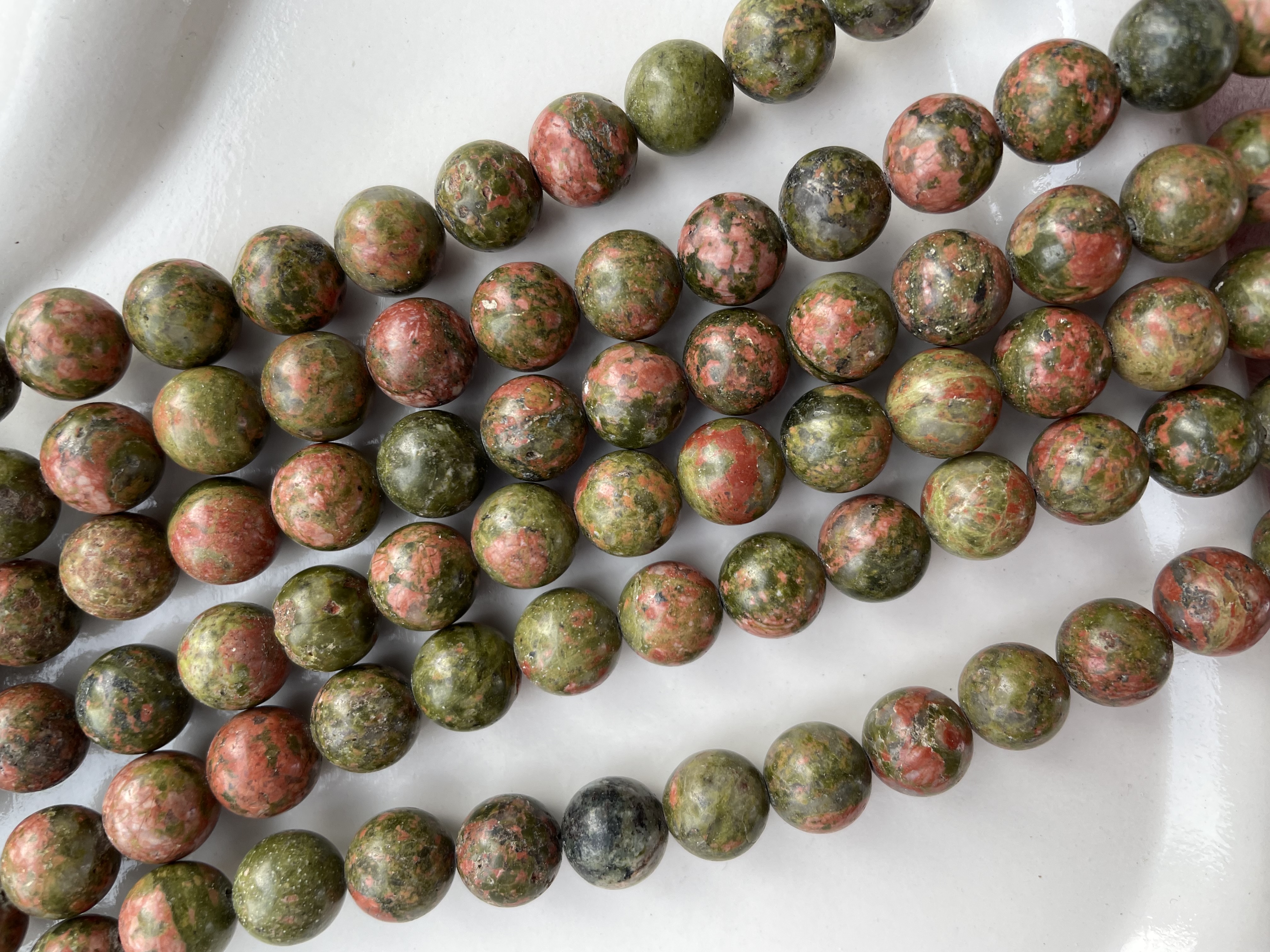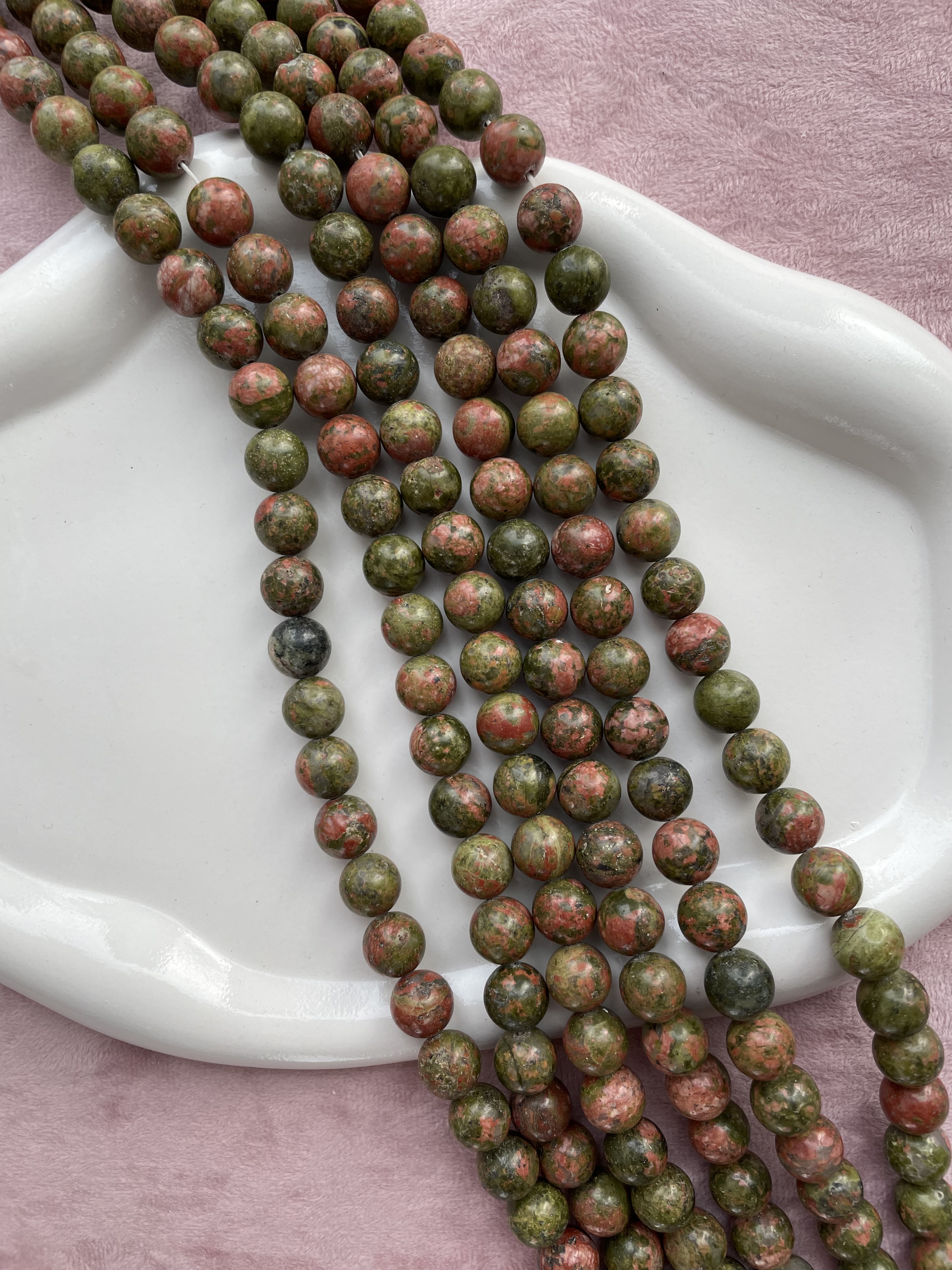 Круглые гладкие бусины из унакита можно использовать для любых видов украшений, идеально подойдет для браслета, колье, чокера, сережек. Камни в нитке неоднородны, могут немного отличаются по цвету и размеру.