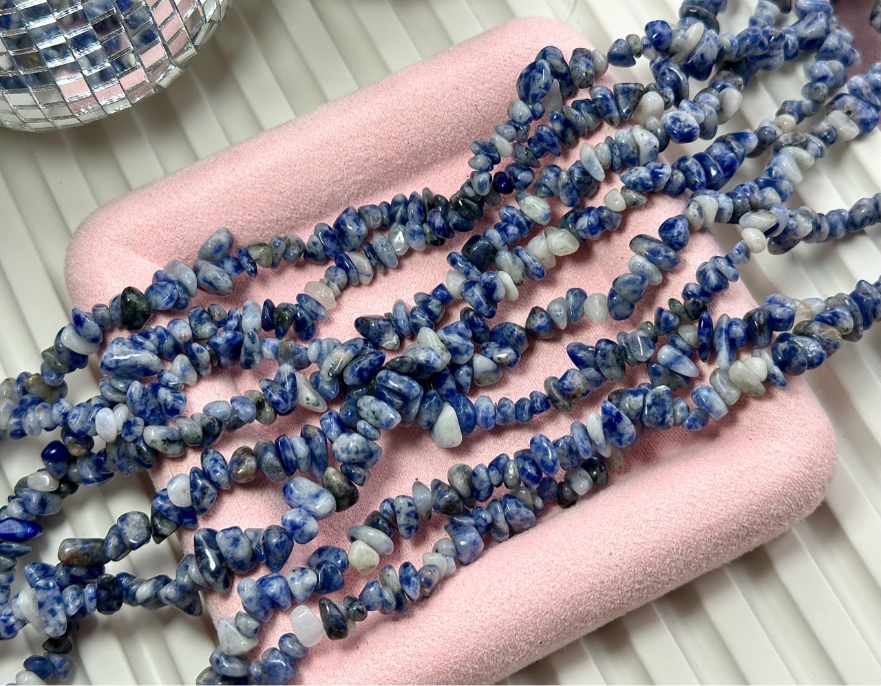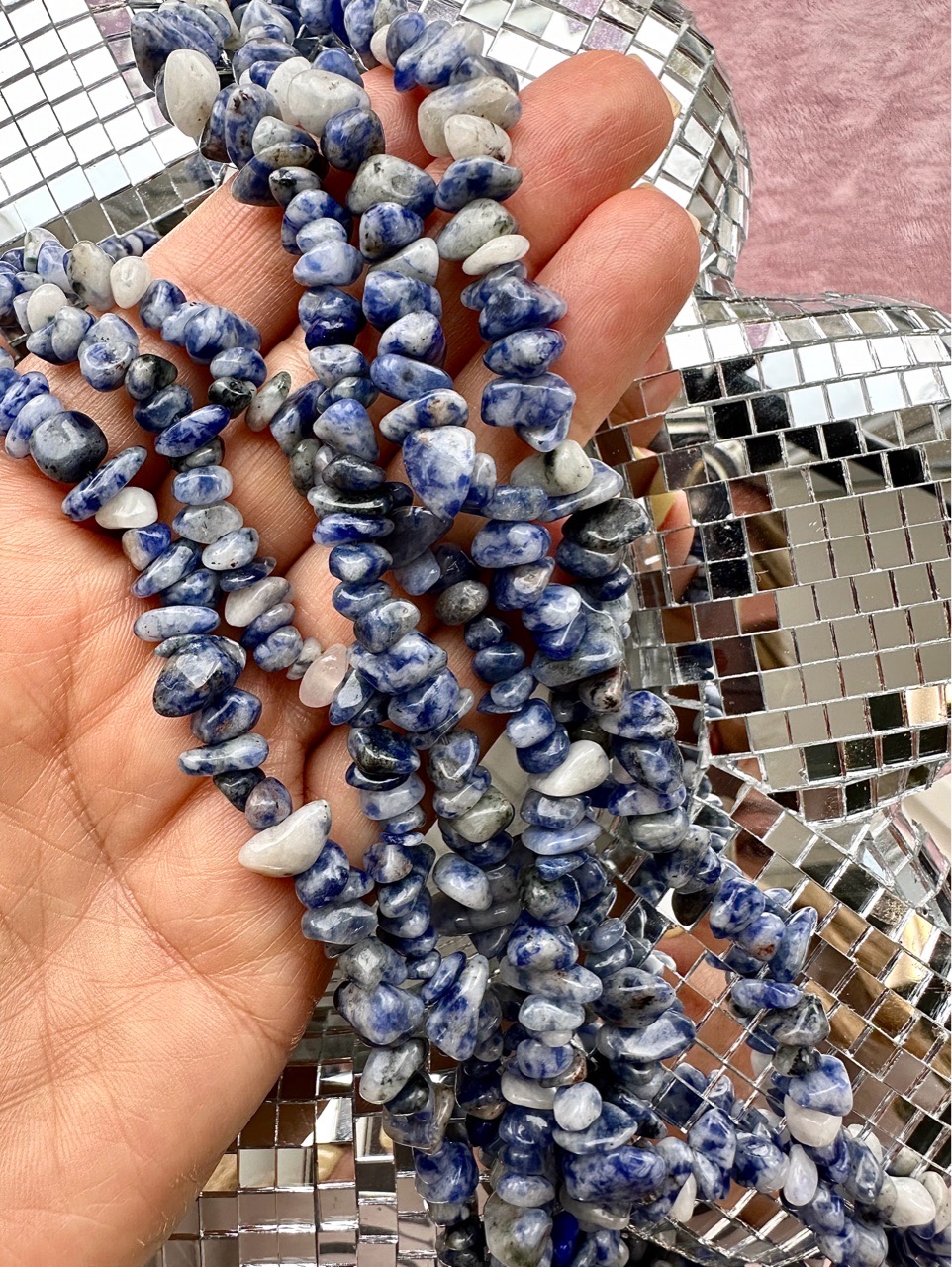 Нить бусин из содалита свободной формы. Камни в нитке неоднородны, отличаются по цвету и размеру. Возможны вкрапления других камней.