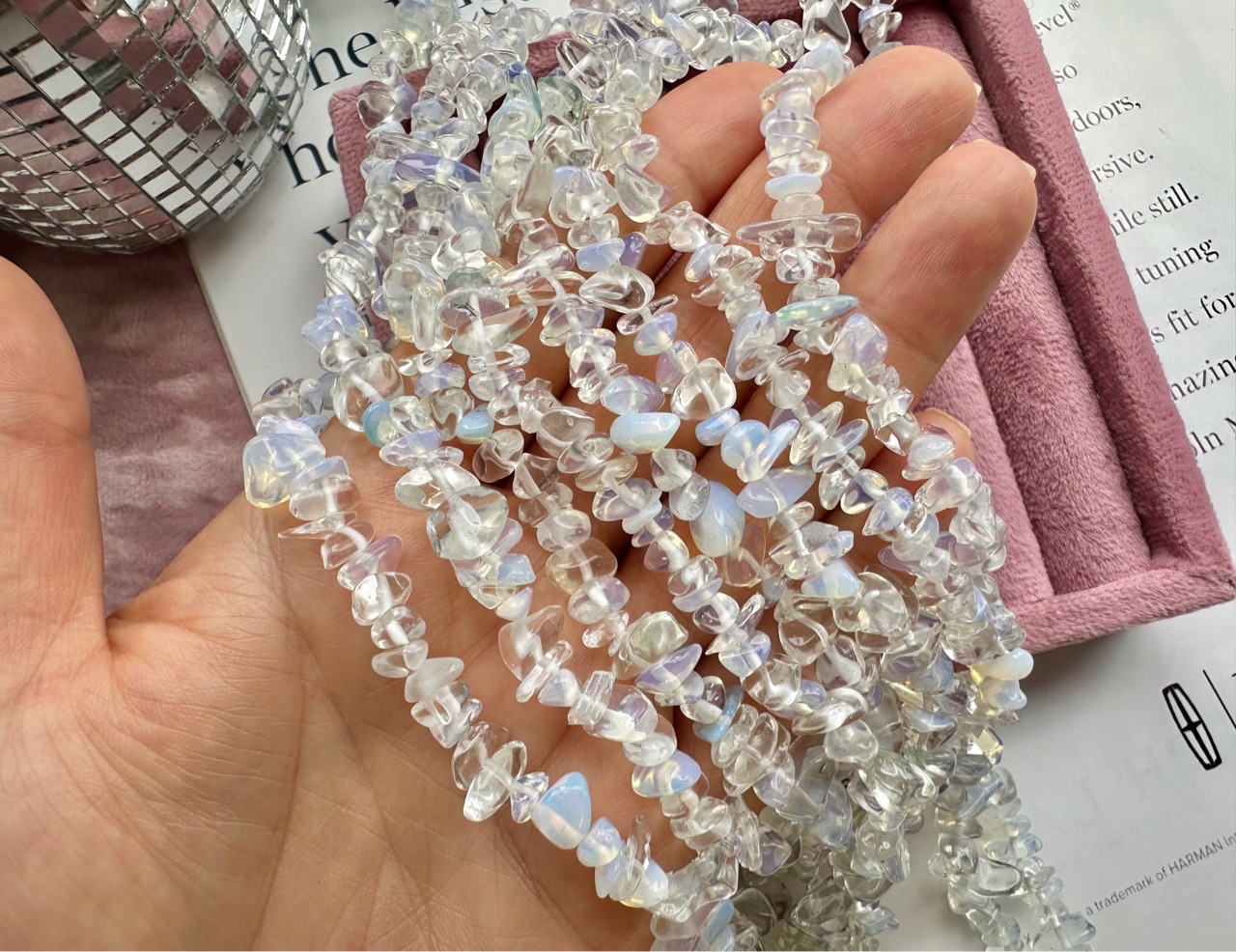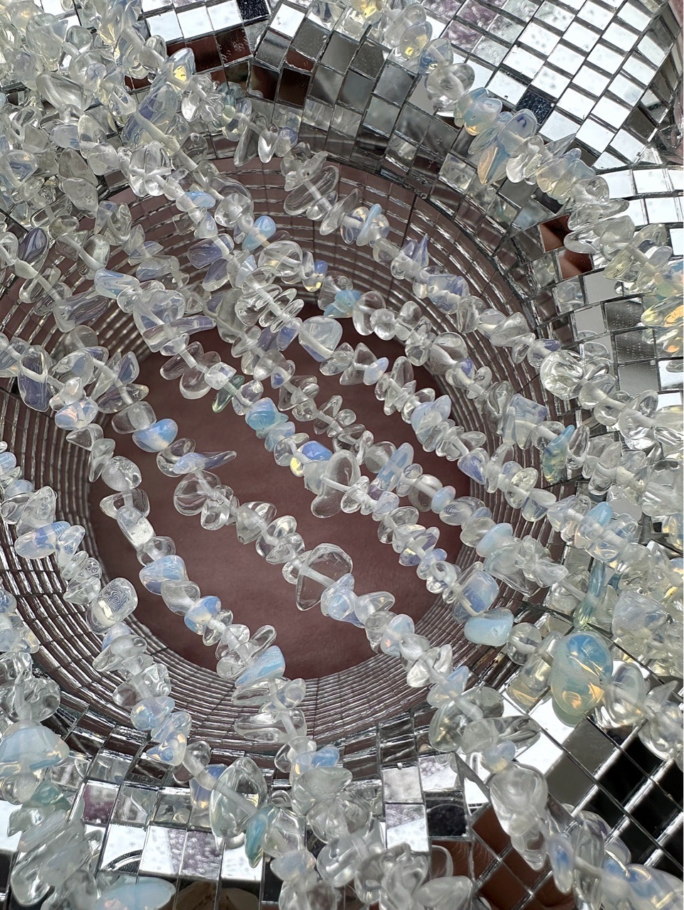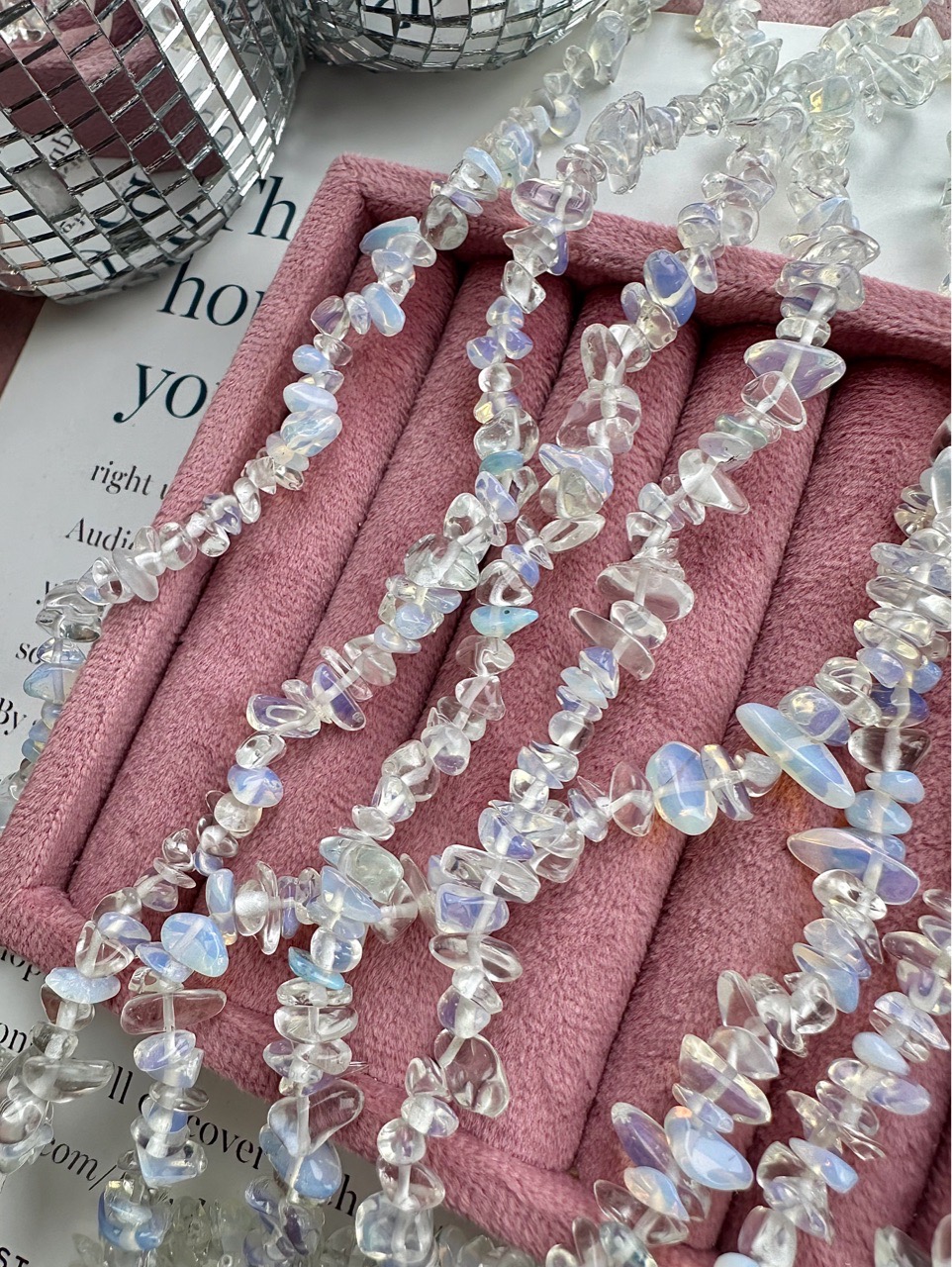 Нить бусин из опалита (имитация опала) свободной формы. Камни в нитке неоднородны, отличаются по цвету и размеру. Возможны вкрапления других камней.
