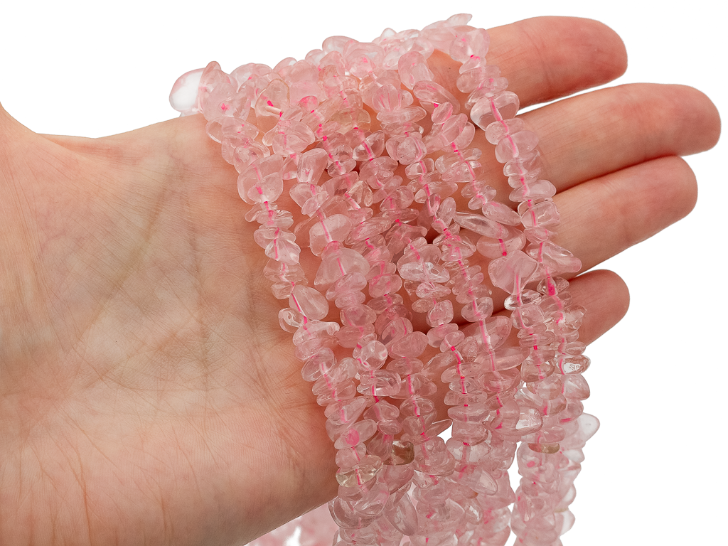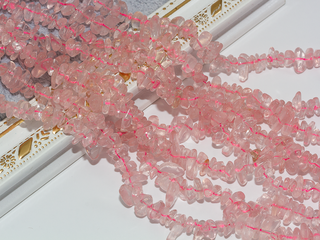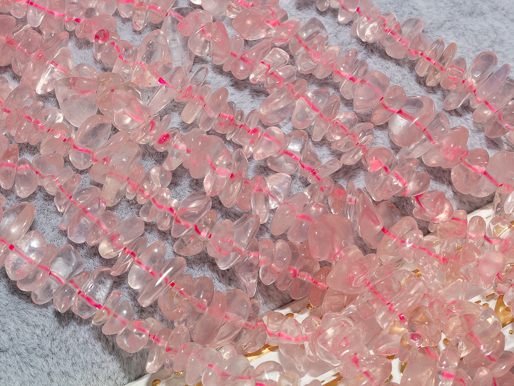 Нить бусин из нежного полупрозрачного розового кварца. Камни в нитке неоднородны, отличаются по цвету и размеру.