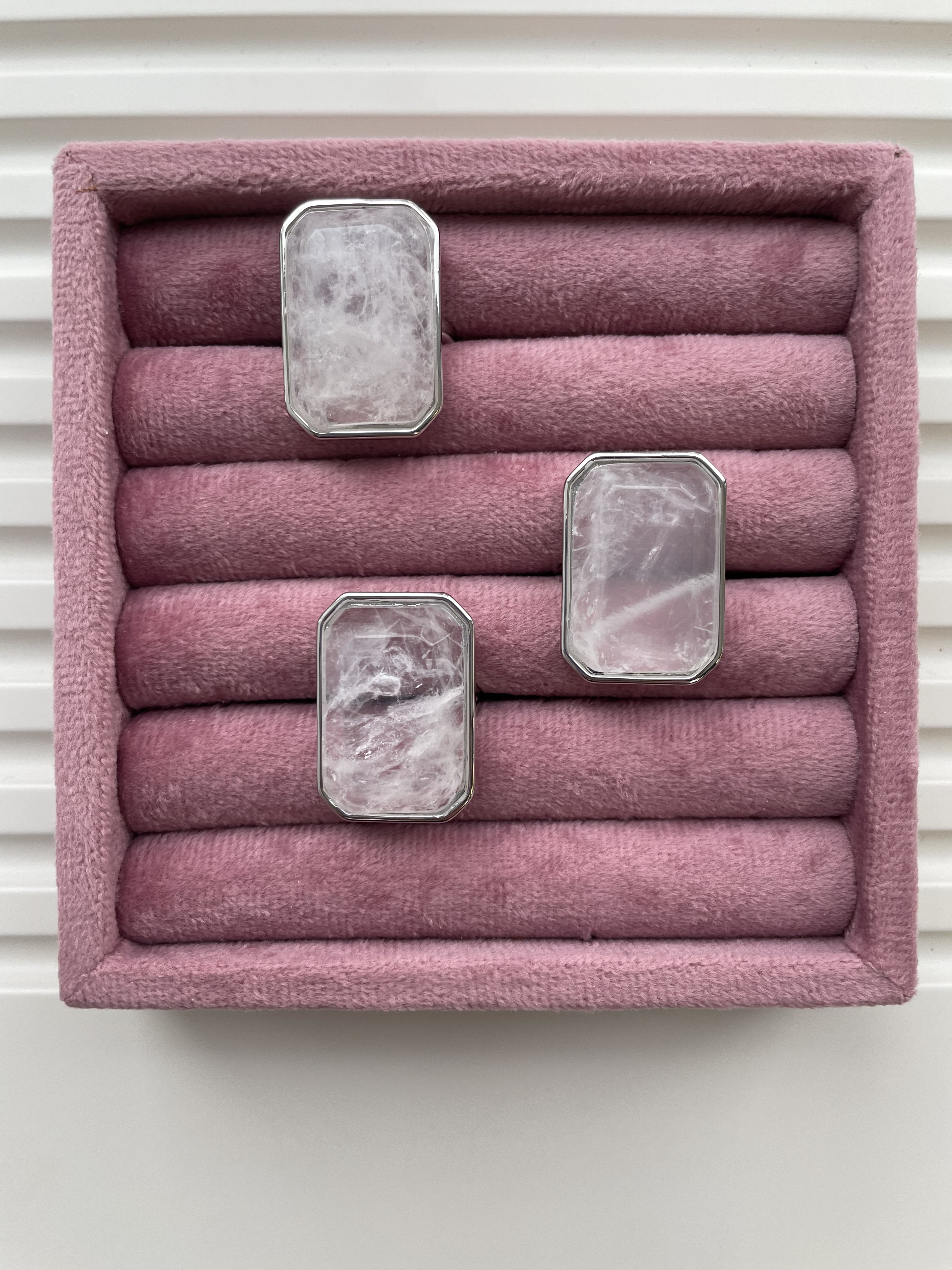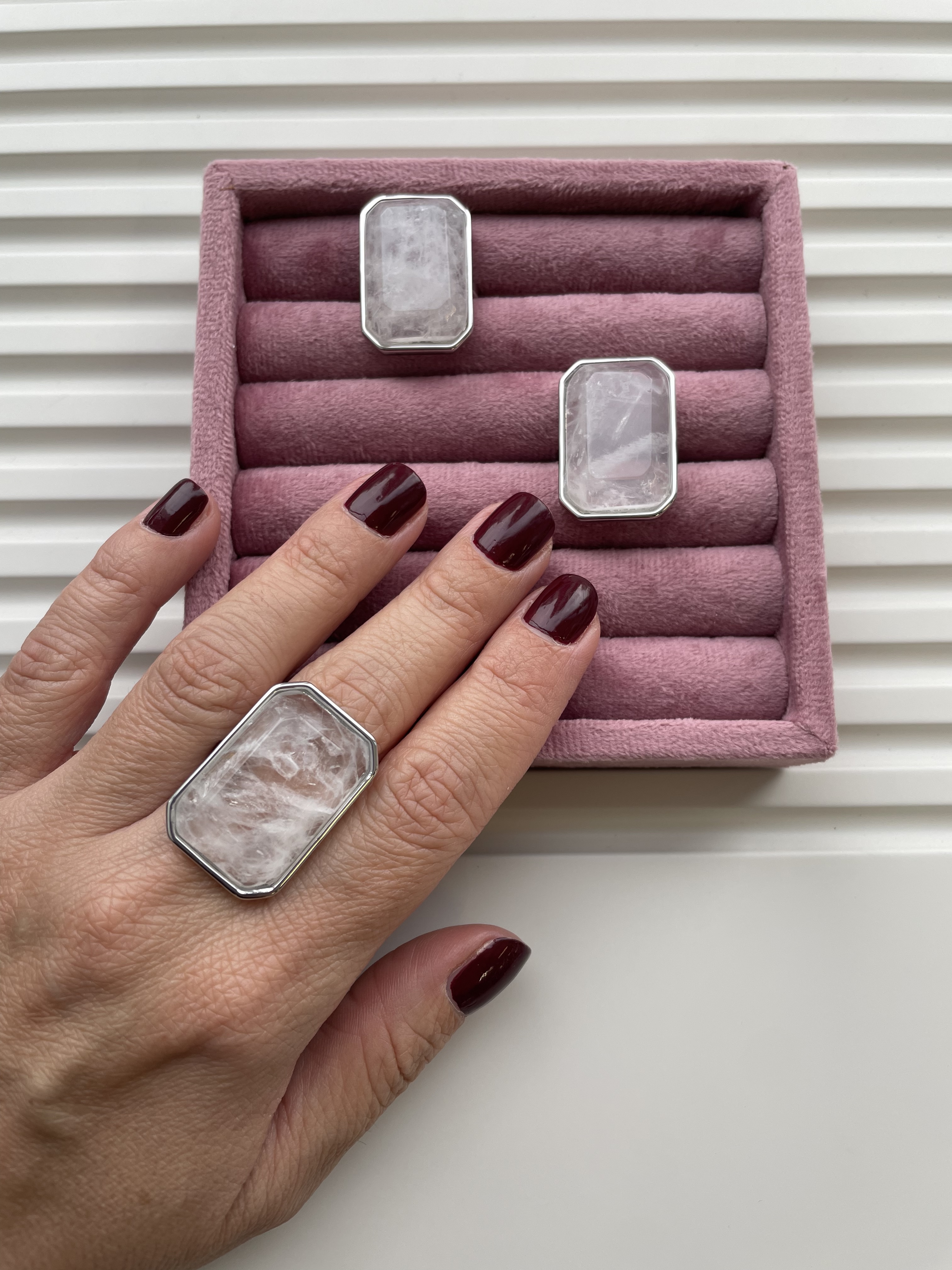 Крупное разъемное кольцо с полупрозрачным кварцем прямоугольной формы, смотрится стильно, обращает внимание на уникальность своей обладательницы, оригинальный дизайн прекрасно дополнит образ, подчеркнув Ваш вкус и женственность.