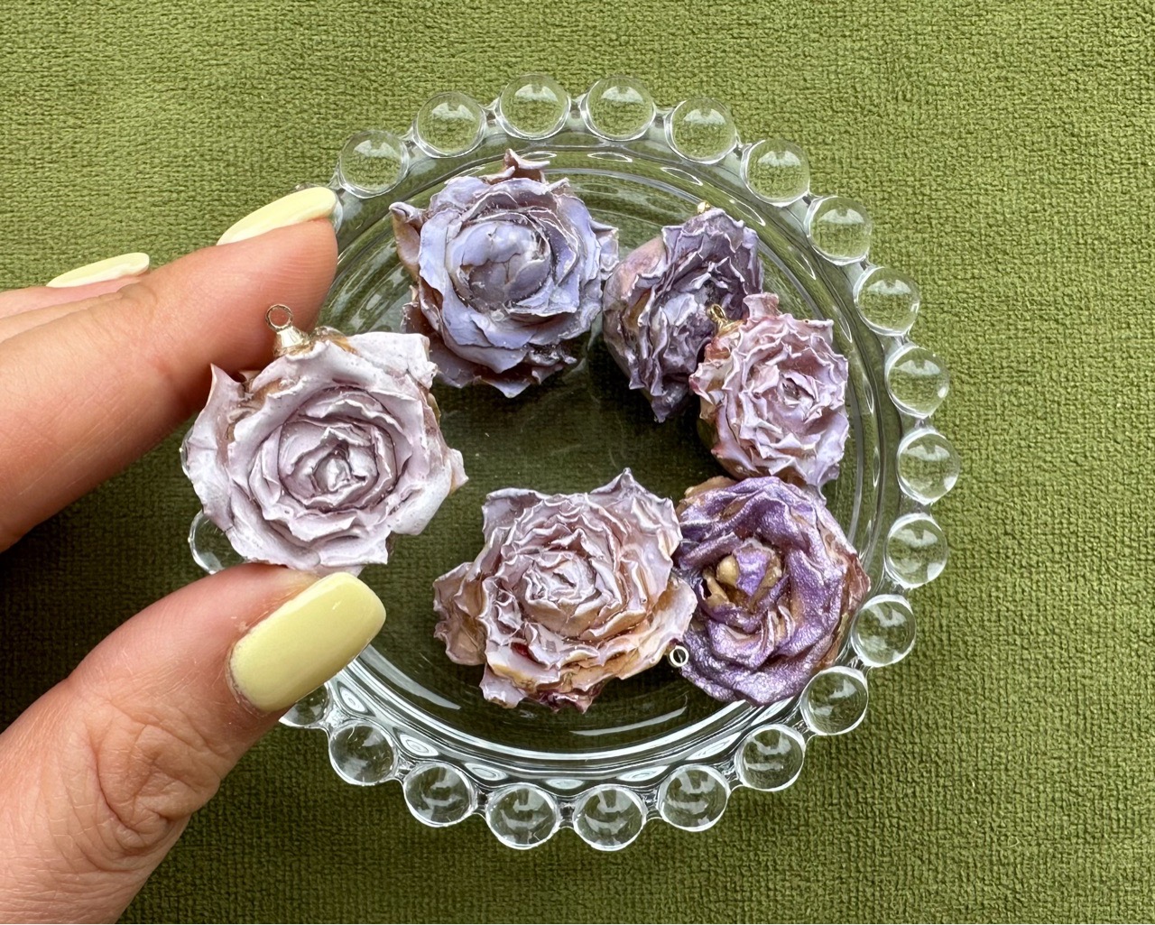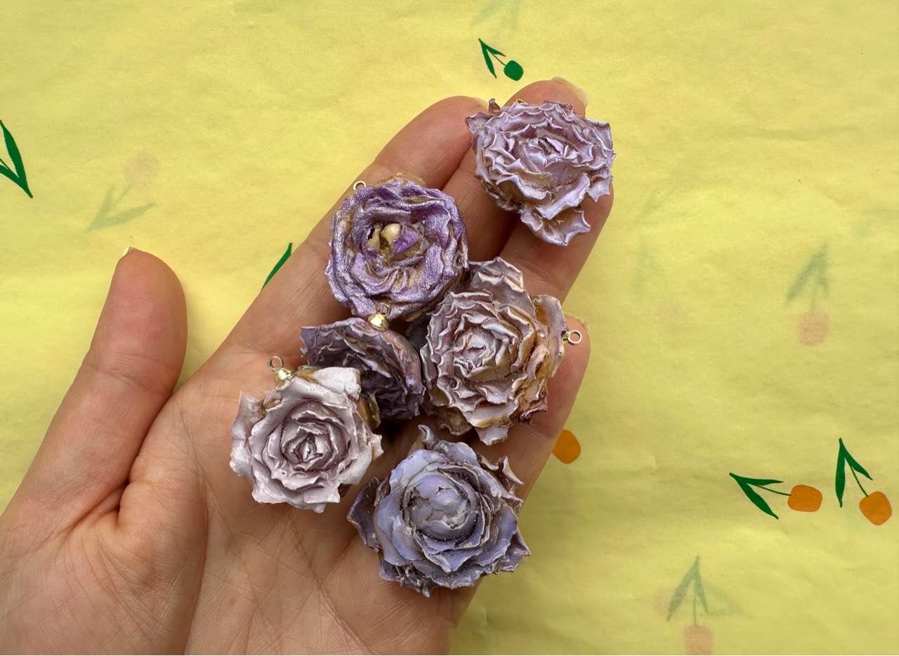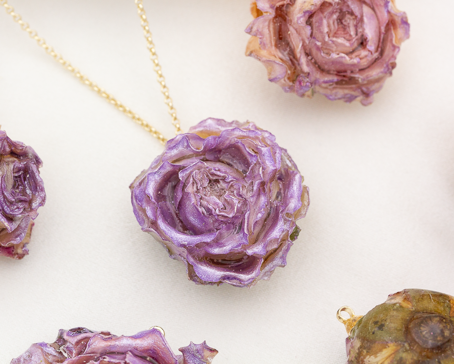 Подвеска ручной работы выполнена из натурального цветка (раскрытый бутон розы), залитого в смолу. Петелька располагается перпендикулярно цветку. Каждая подвеска уникальна.