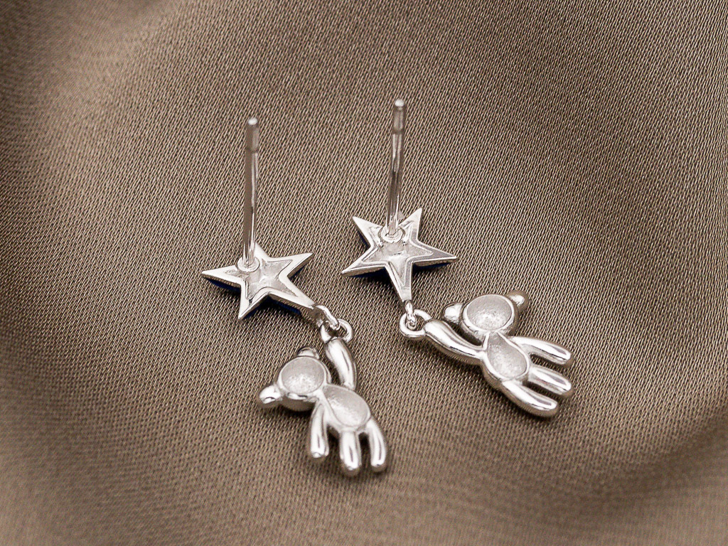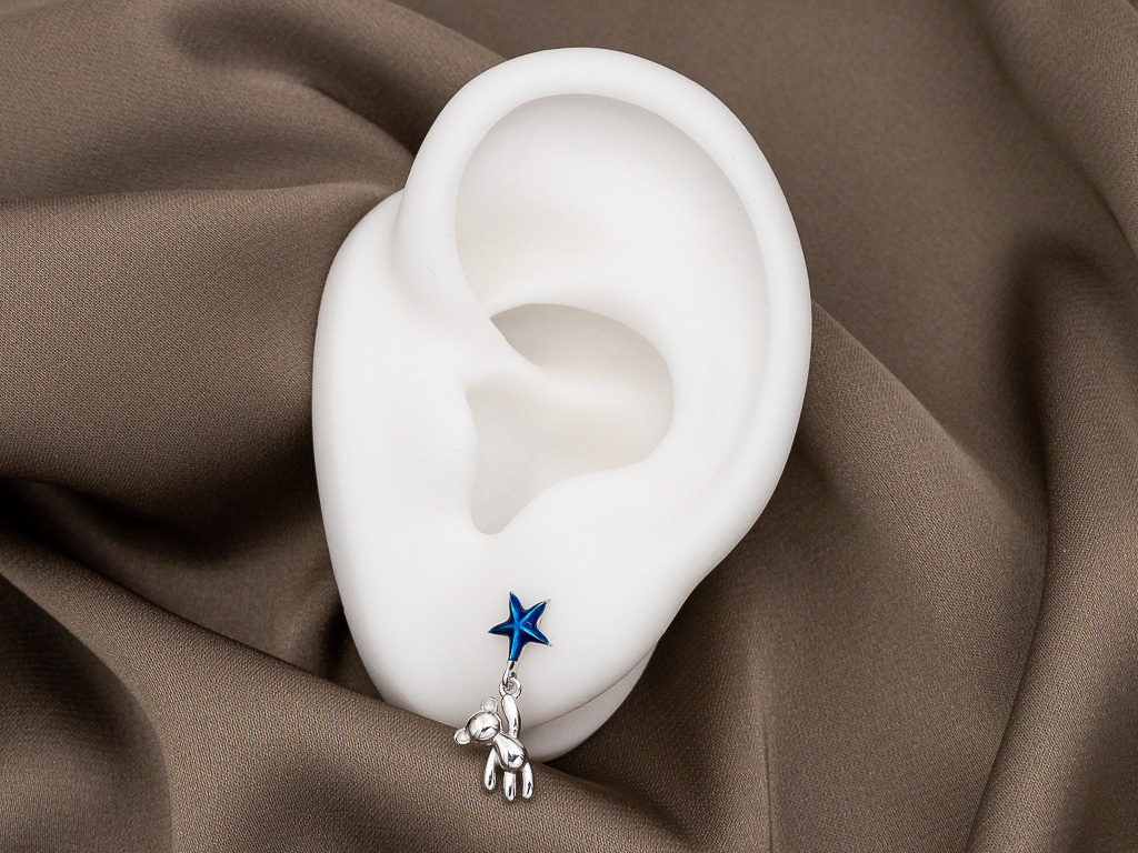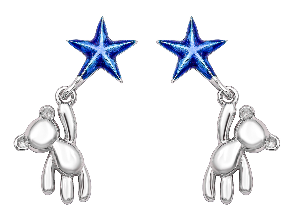 Милые серьги-гвоздики в форме маленькой звездочки с подвесом-медвежонком смотрятся стильно, удобны в носке и подчеркивают уникальность своей обладательницы. Очаровательный медвежонок влюбляет в себя с первого взгляда. Серьги никого не оставят равнодушным.