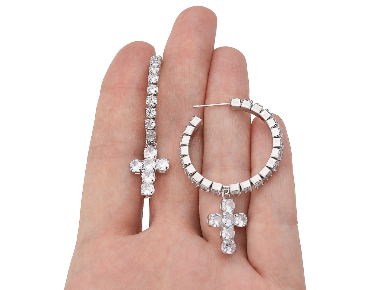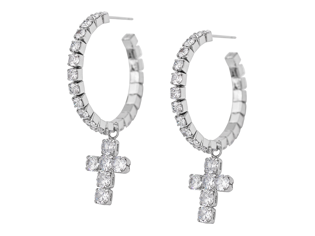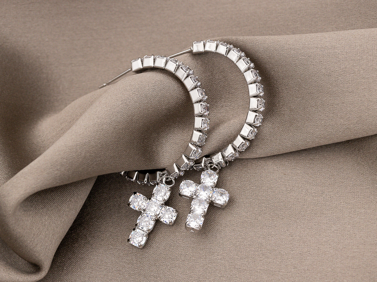 Эффектные Серьги-Кольца с подвесом - крестик, украшенные стразами смотрятся стильно.
