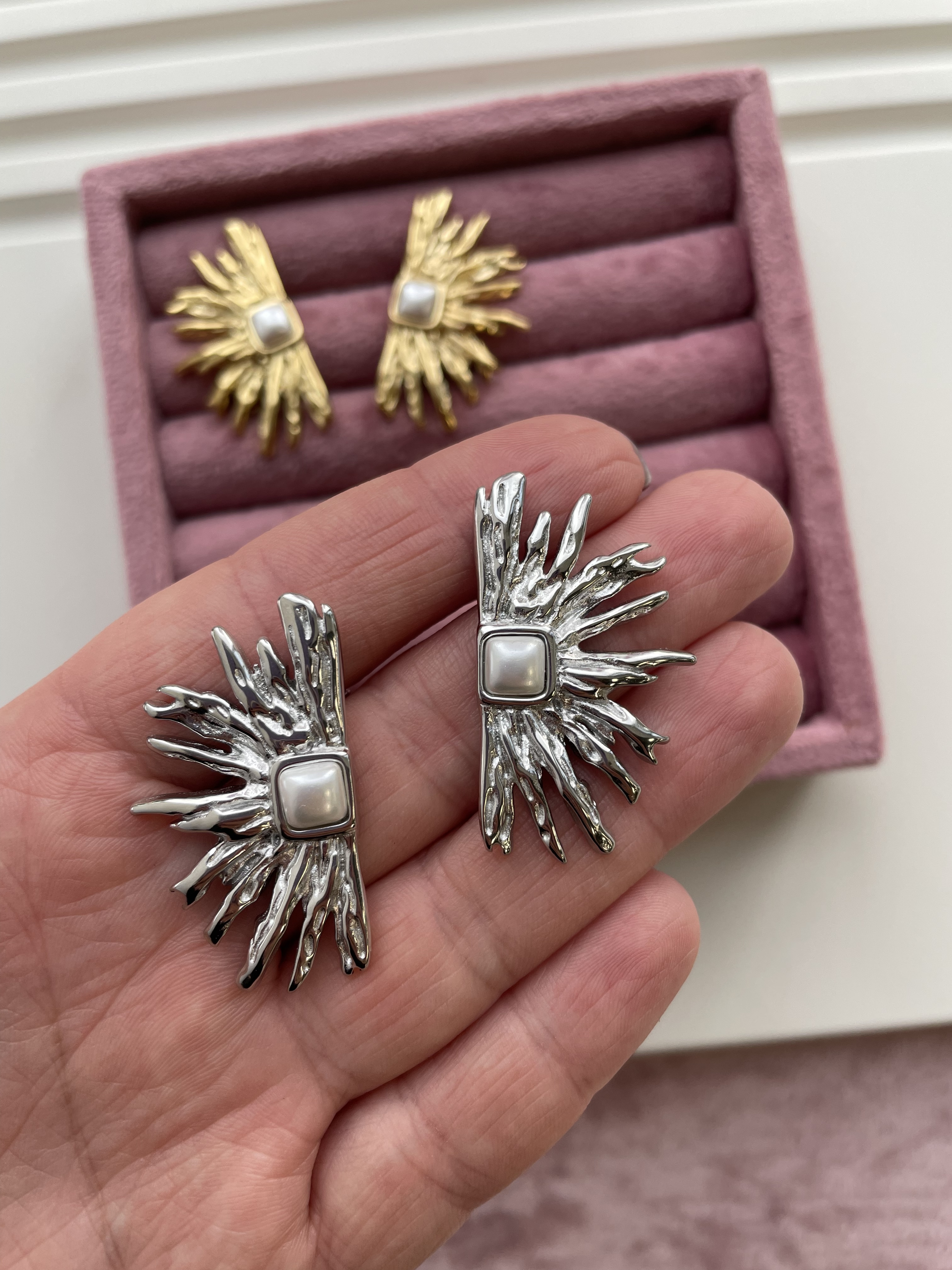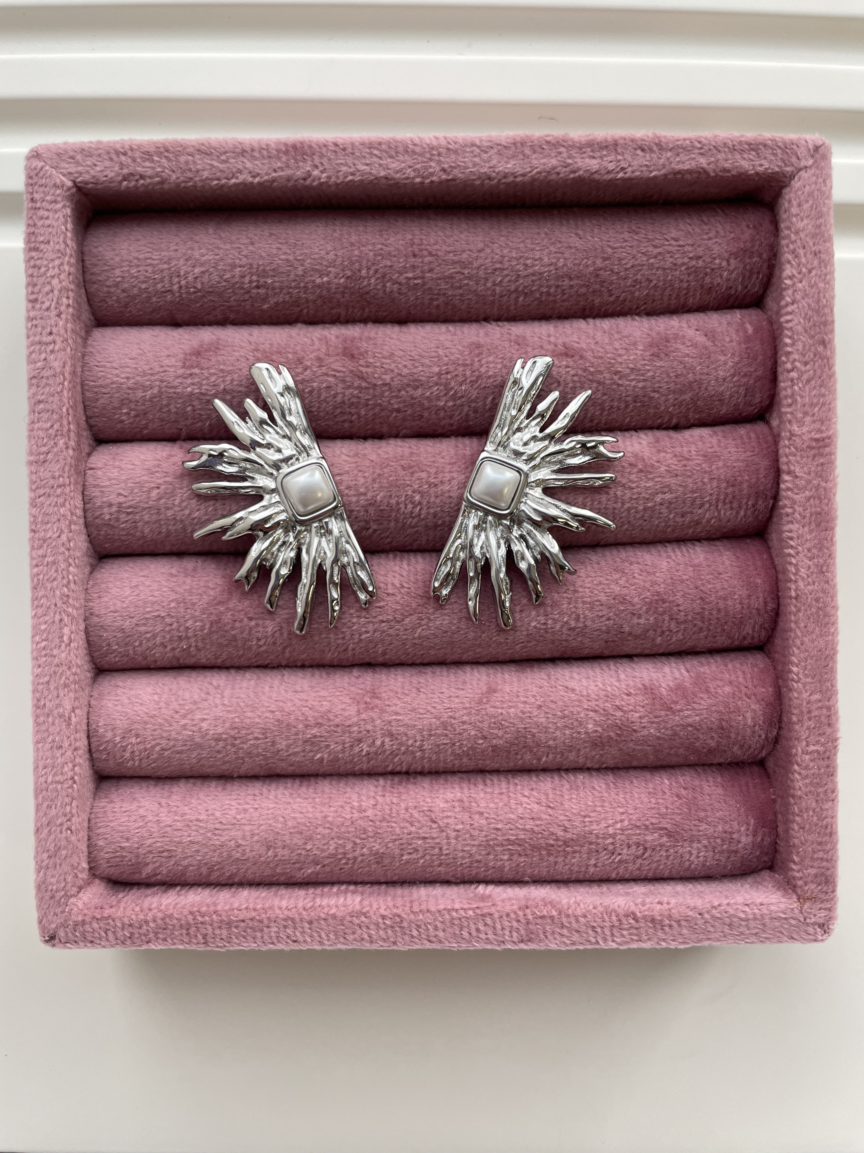 Акцентные серьги-гвоздики в форме стилизованных расходящихся от центра лучей смотрятся оригинально, удобны в носке и подчеркивают уникальность своей обладательницы.