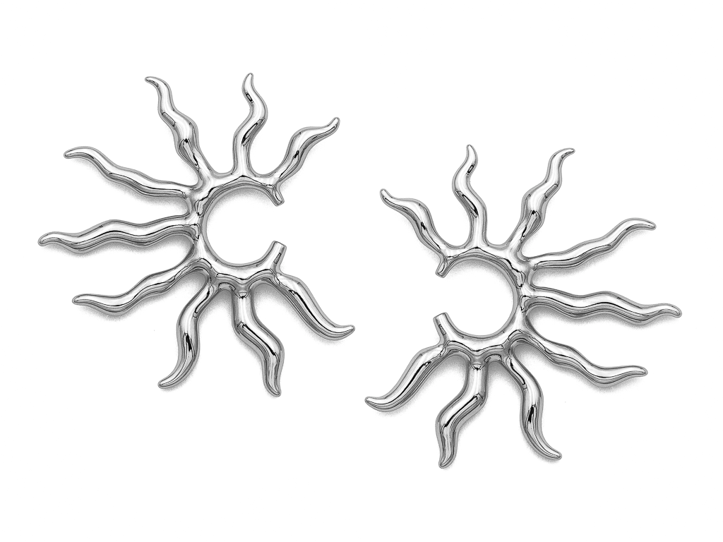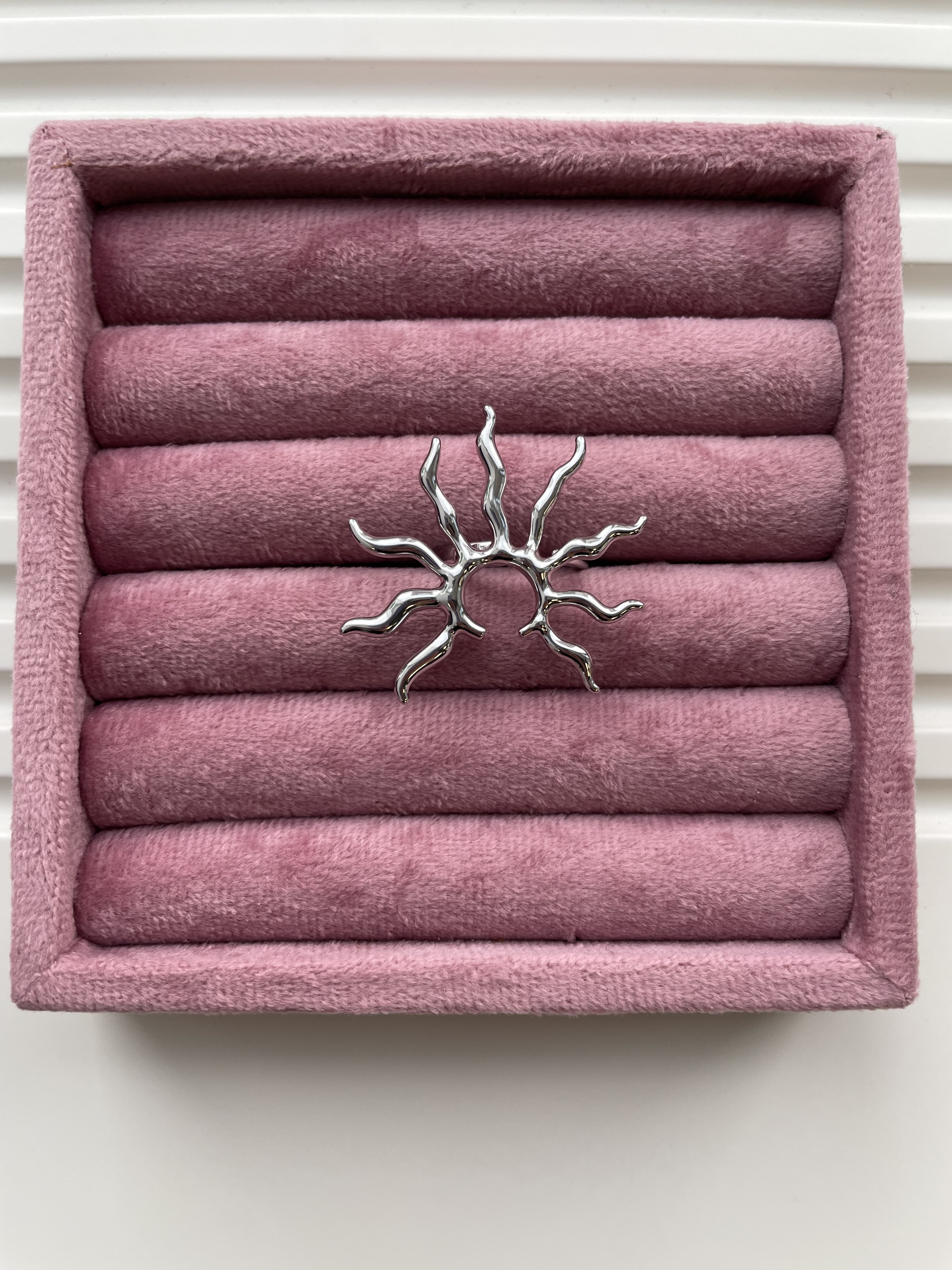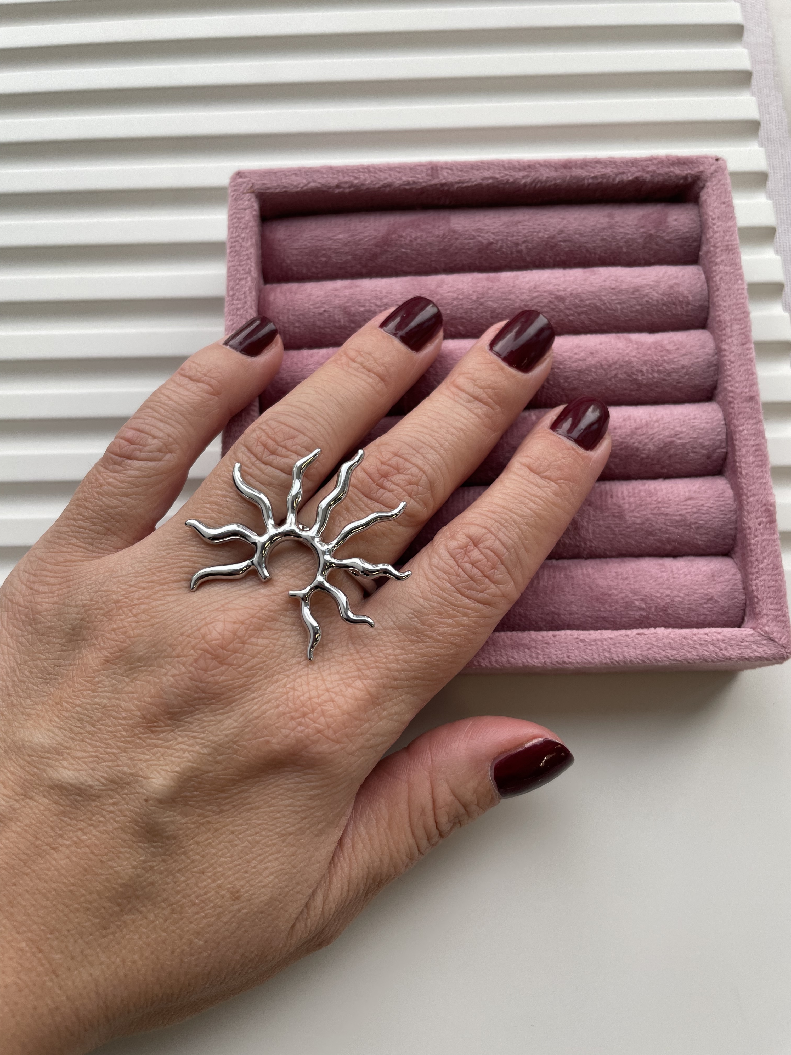 Акцентное, крупное кольцо в форме стилизованного солнца смотрится стильно, подчеркивает уникальность своей обладательницы.