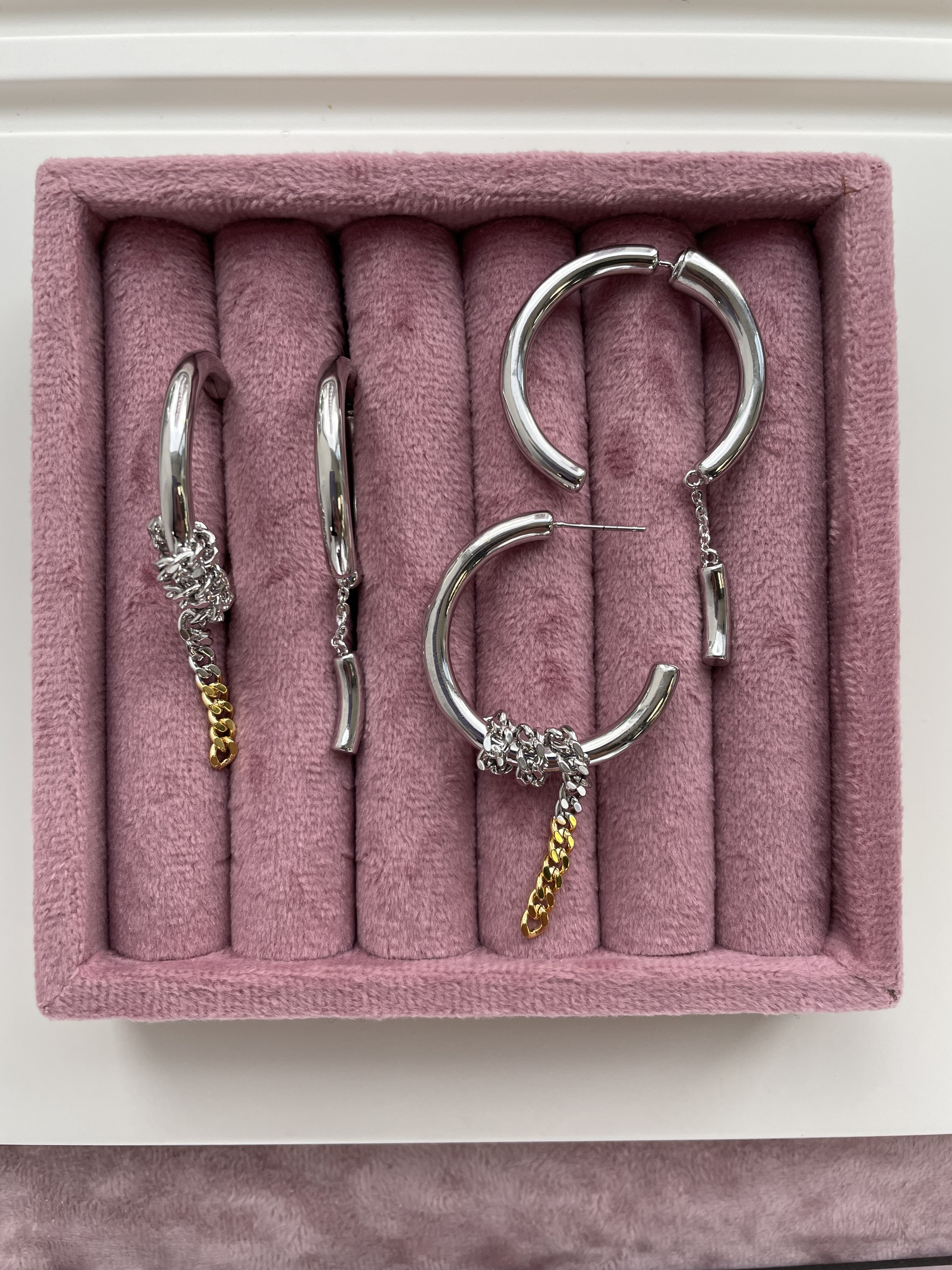 Оригинальные ассиметричные серьги-кольца с цепями.