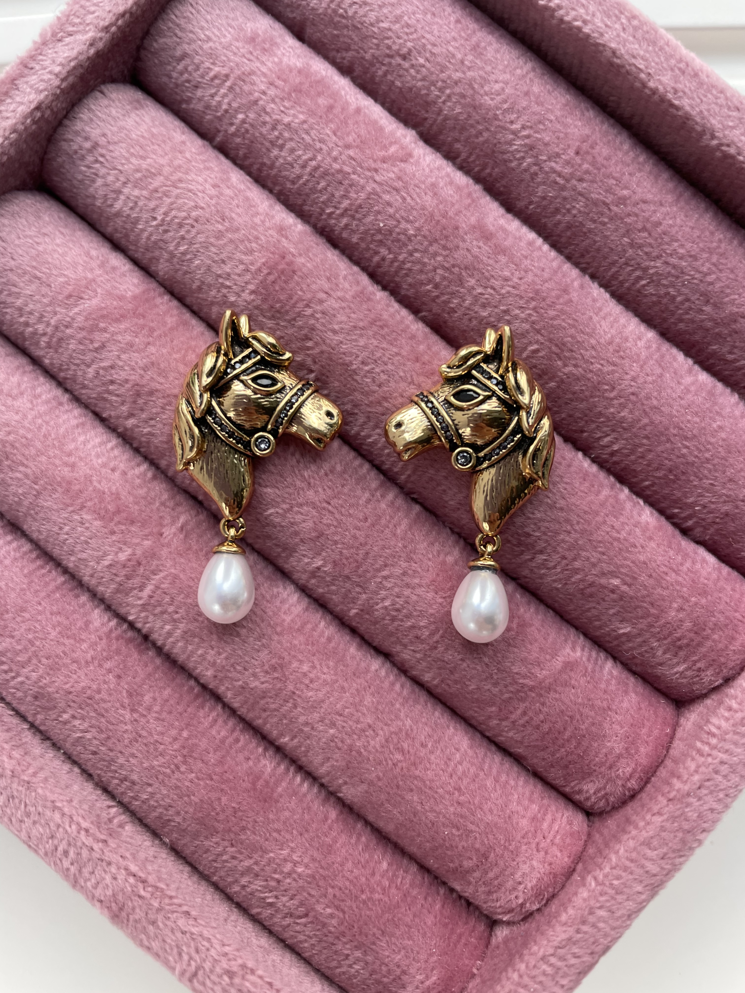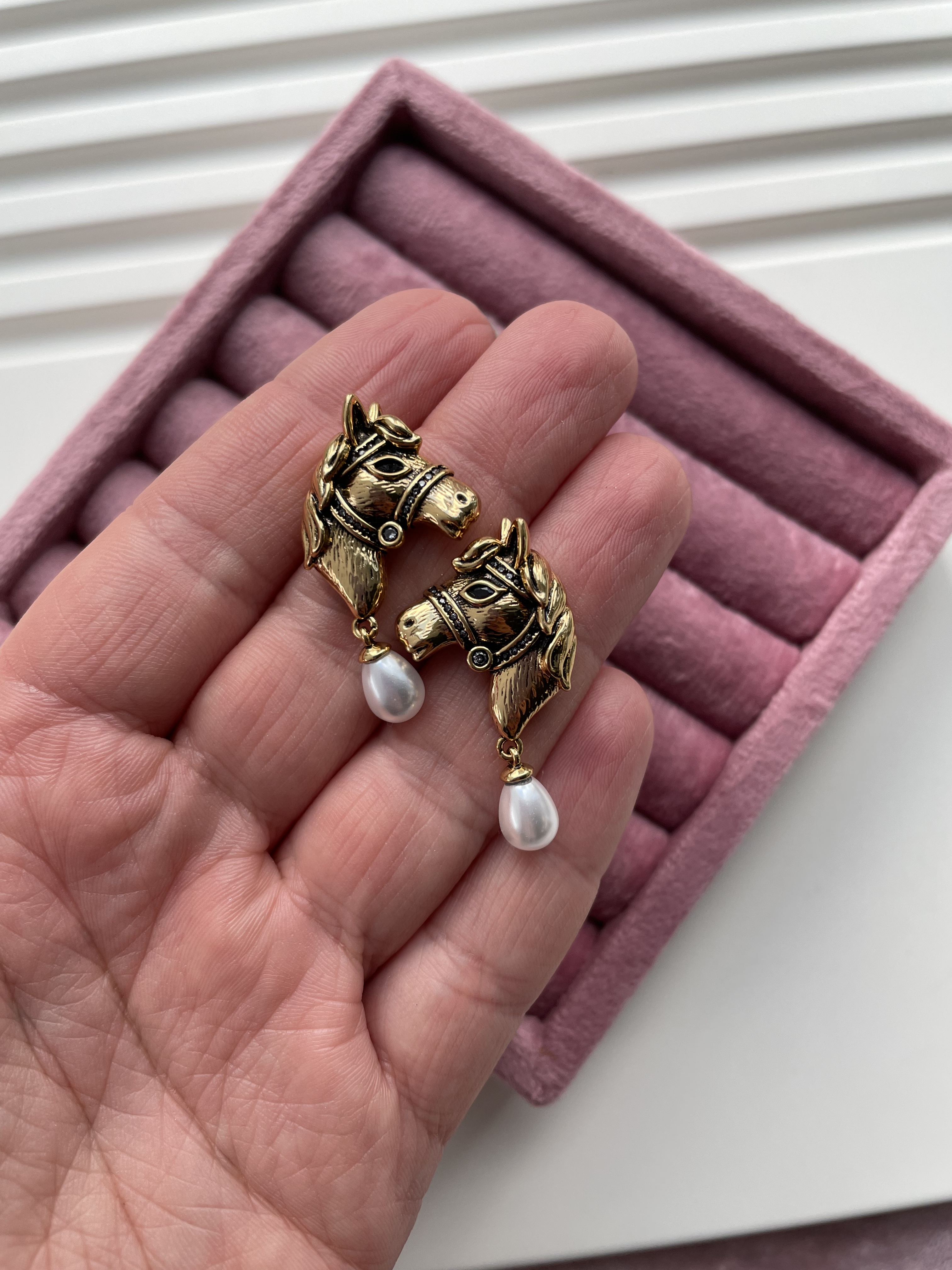 Необычные серьги-гвоздики в виде головы лошади с жемчужной подвеской для смелых и ярких.