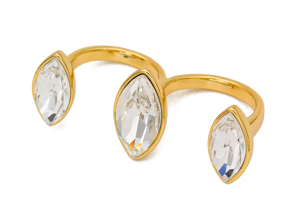 Необычное, акцентное кольцо на два пальца с кристаллами ювелирной огранки смотрится стильно, эффектно. Несмотря на необычную форму очень комфортно в носке. Оригинальный дизайн прекрасно дополнит образ, подчеркнув ваш вкус.