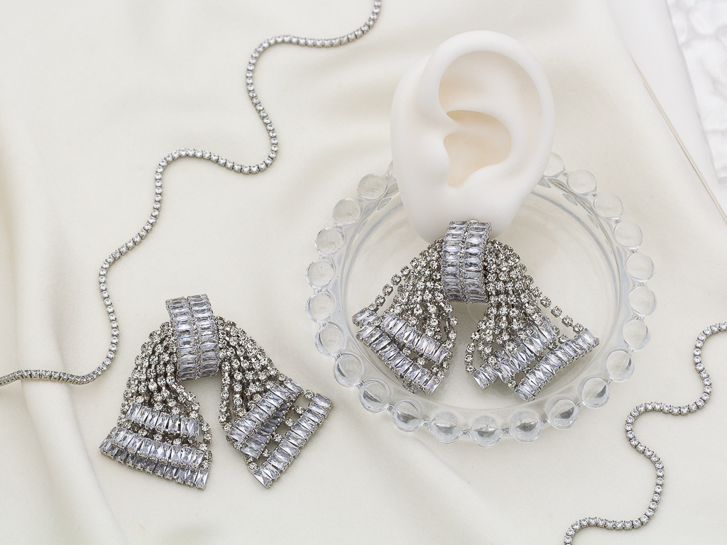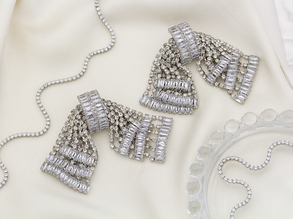 Стильные вечерние серьги-гвоздики в форме банта, инкрустированные прозрачными кристаллами и стразами не оставят равнодушным никого.