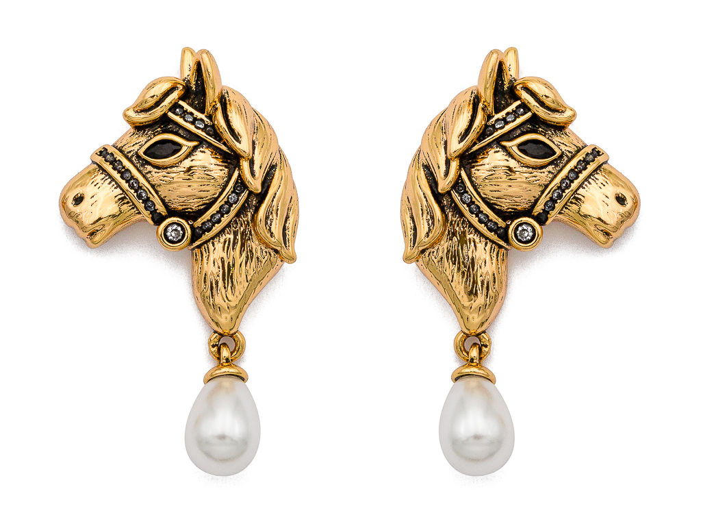 Необычные серьги-гвоздики в виде головы лошади с жемчужной подвеской для смелых и ярких.