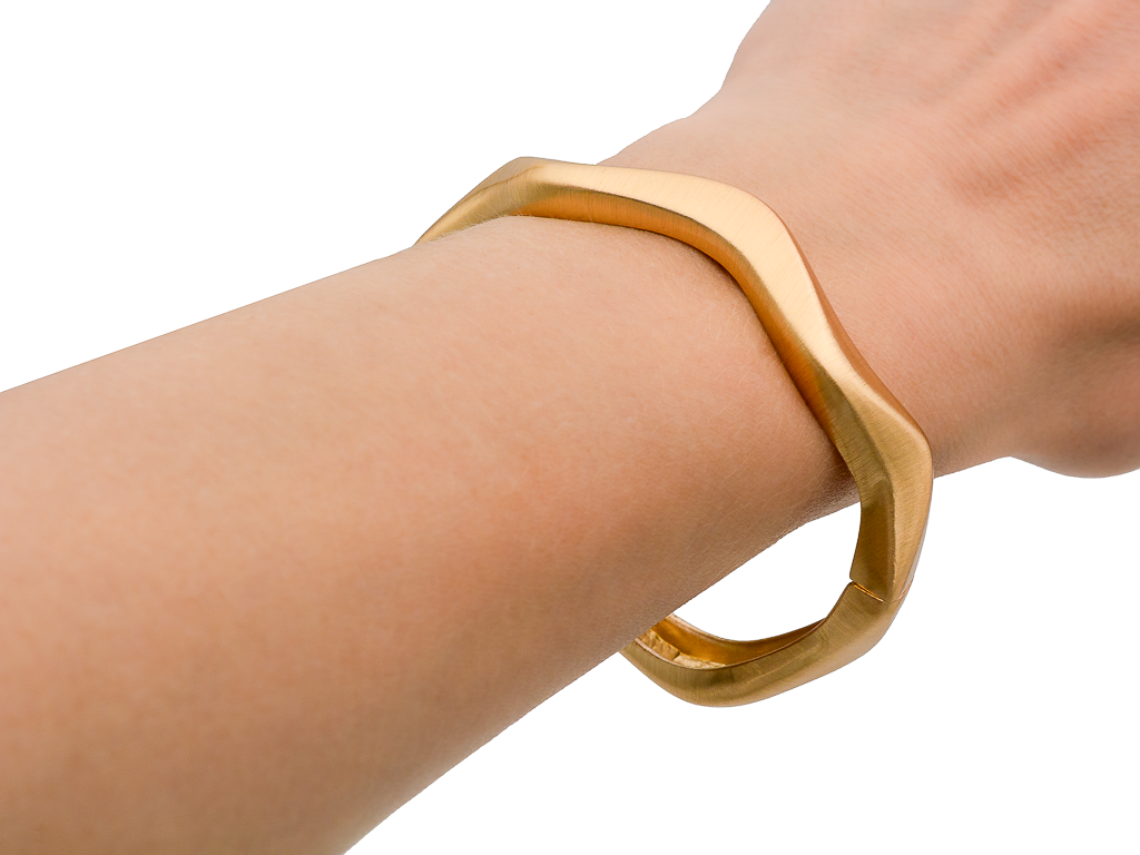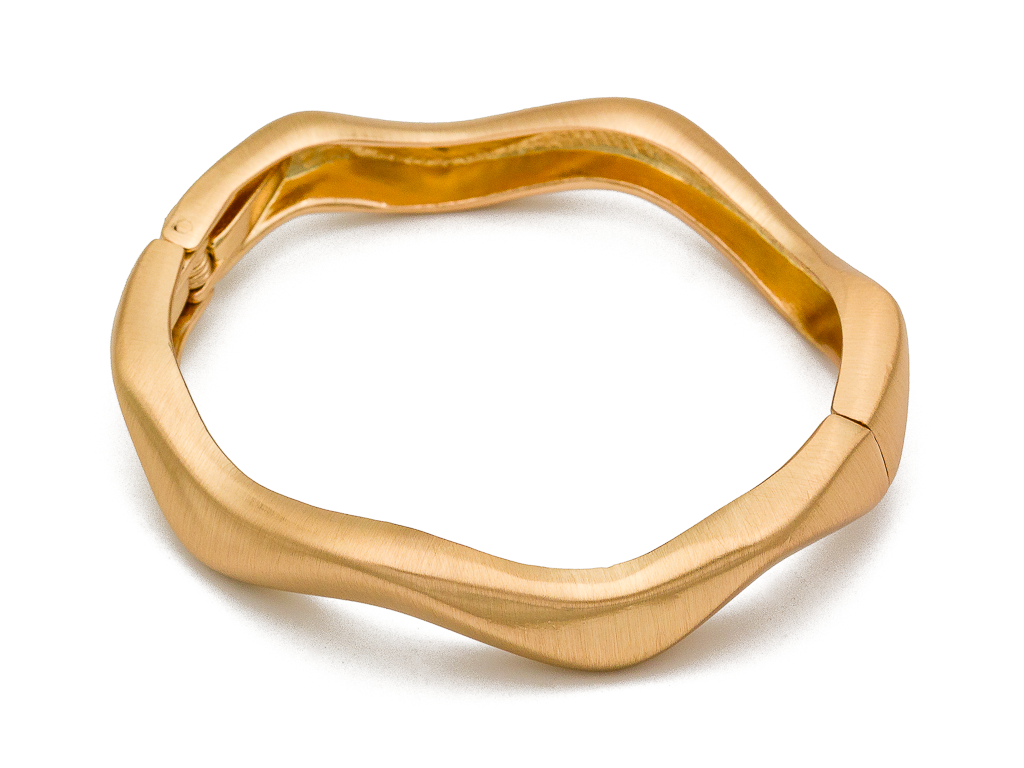 Крупный, жесткий браслет с сатиновым эффектом смотрится стильно, удобен в носке. С таким украшением вы точно не останетесь незамеченной.
