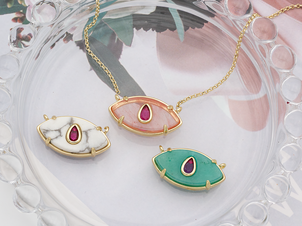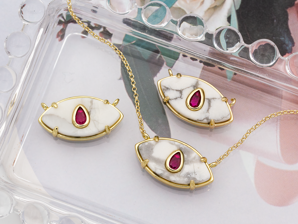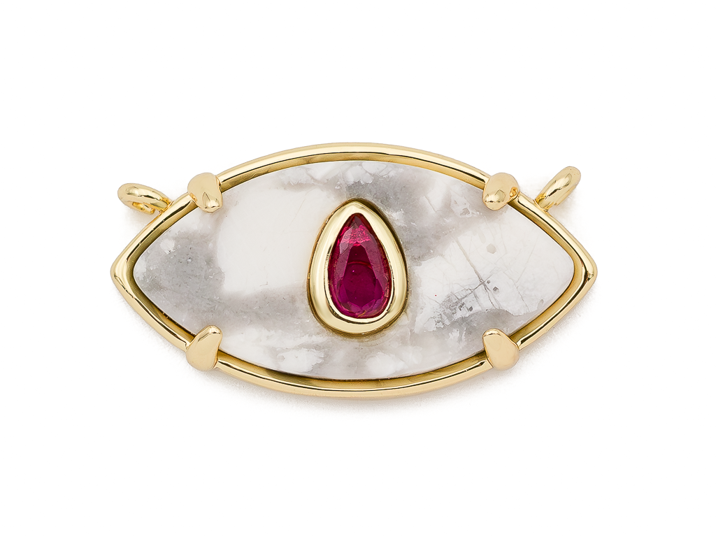 Небольшая овальная подвеска, по форме напоминающая глаз, со вставкой из говлита и рубинового фианита ювелирной огранки отлично подойдет на чокер или колье.