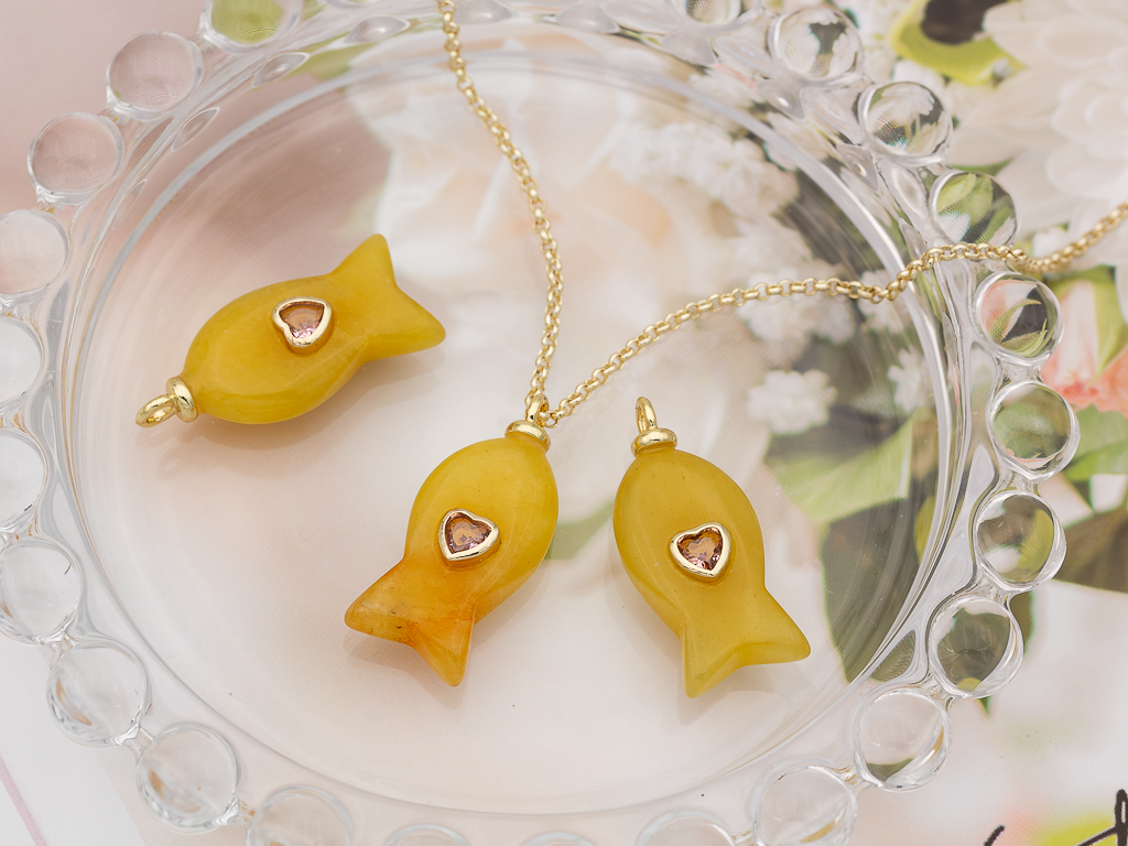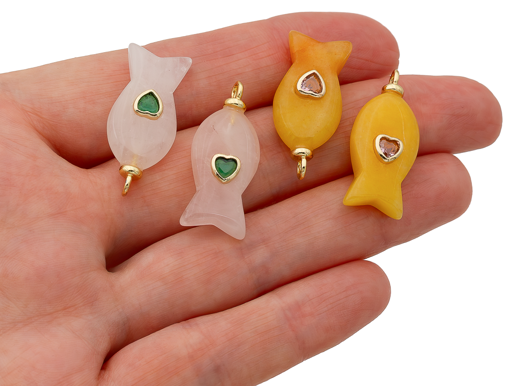 Подвеска в форме рыбки из гладкого кварца со вставкой из розового кристалла в форме сердца отлично подойдет для создания колье, чокера, сережек. Хорошо будет смотреться с крупными цепями, шнурами, жемчугом, натуральными камнями.