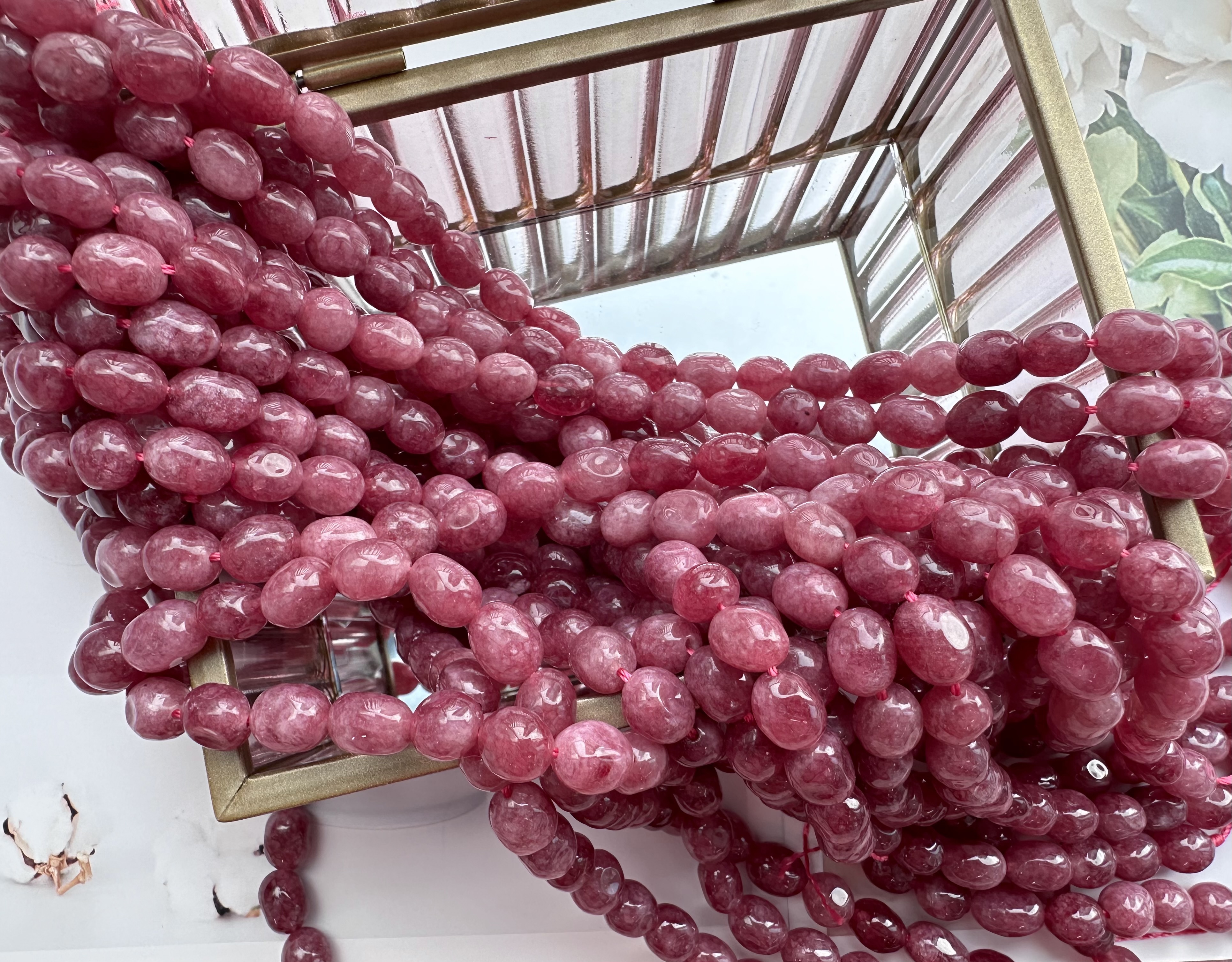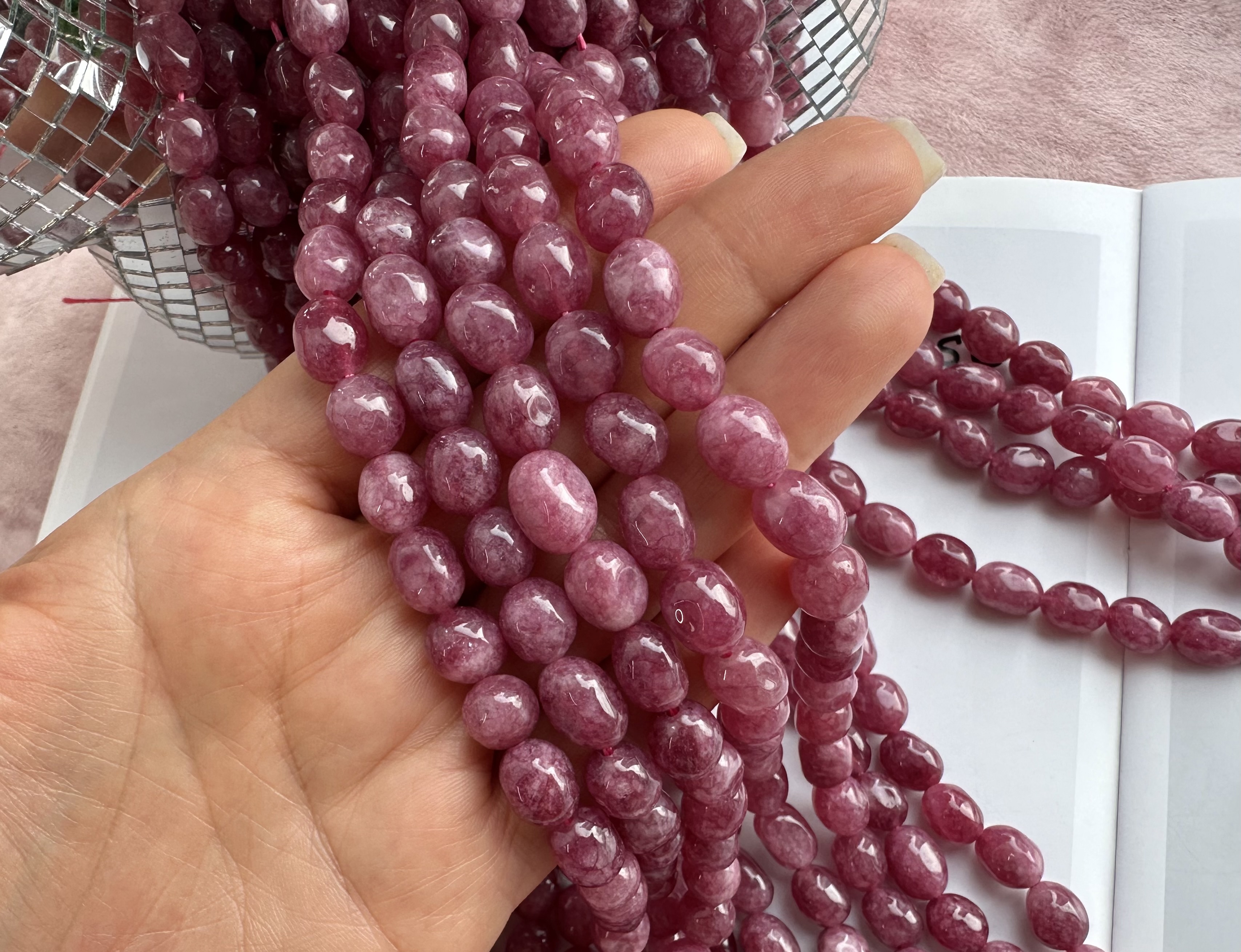 Бусины из кварца можно использовать для создания любых видов украшений, идеально подойдут на колье, чокер, браслет, серьги. Камни в нитке неоднородны, отличаются по цвету и размеру.