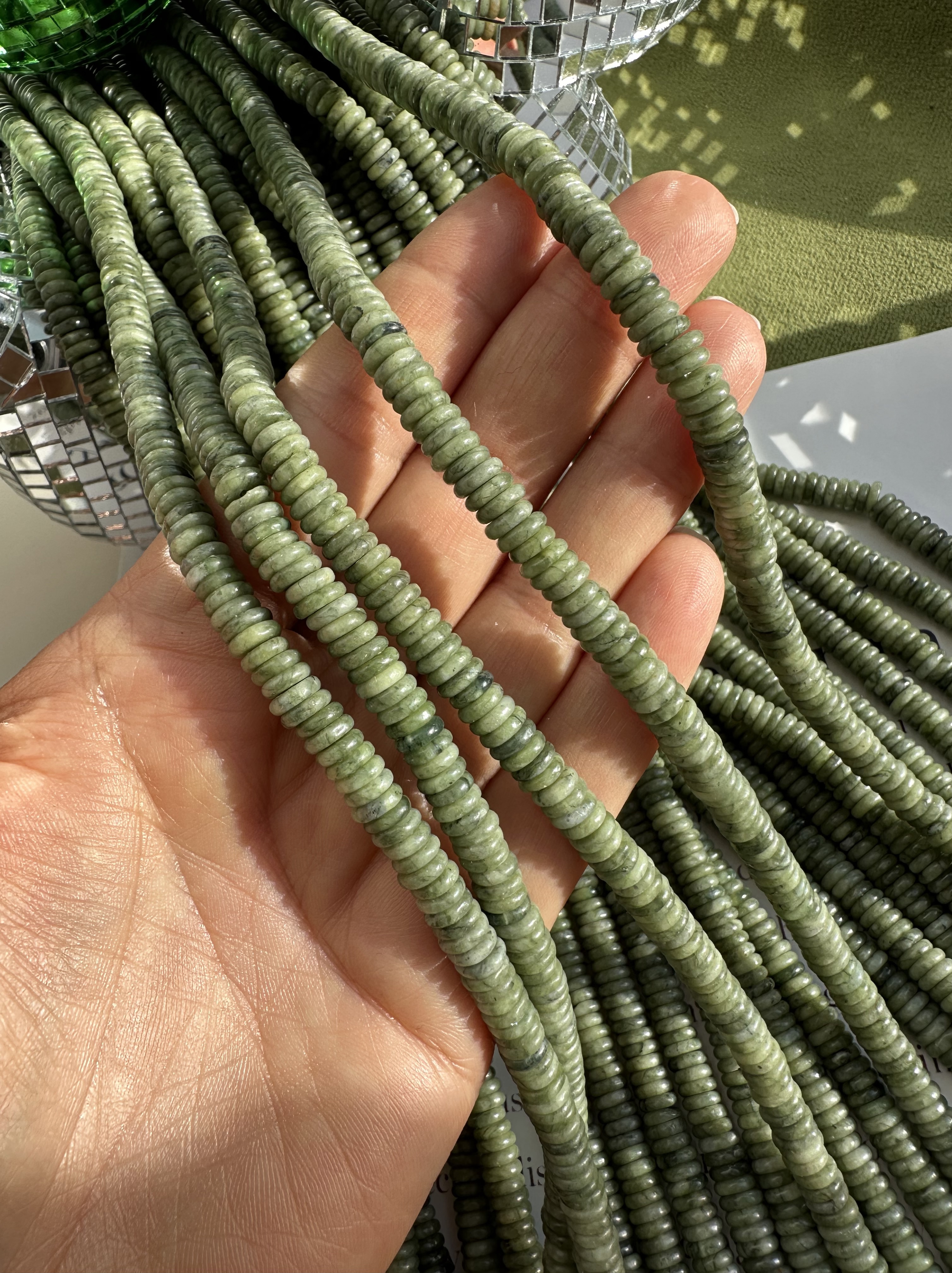 Бусины из нефрита в форме ронделя могут использоваться для создания любых видов украшений, в том числе идеально подойдут на чокер или браслет. Бусины отлично сочетаются с различными материалами: натуральным жемчугом, перламутром, а также металлическими бусинами и подвесками. Бусины в нитке неоднородны, не одинаковы по размеру, толщине, несущественно отличаются по цвету.