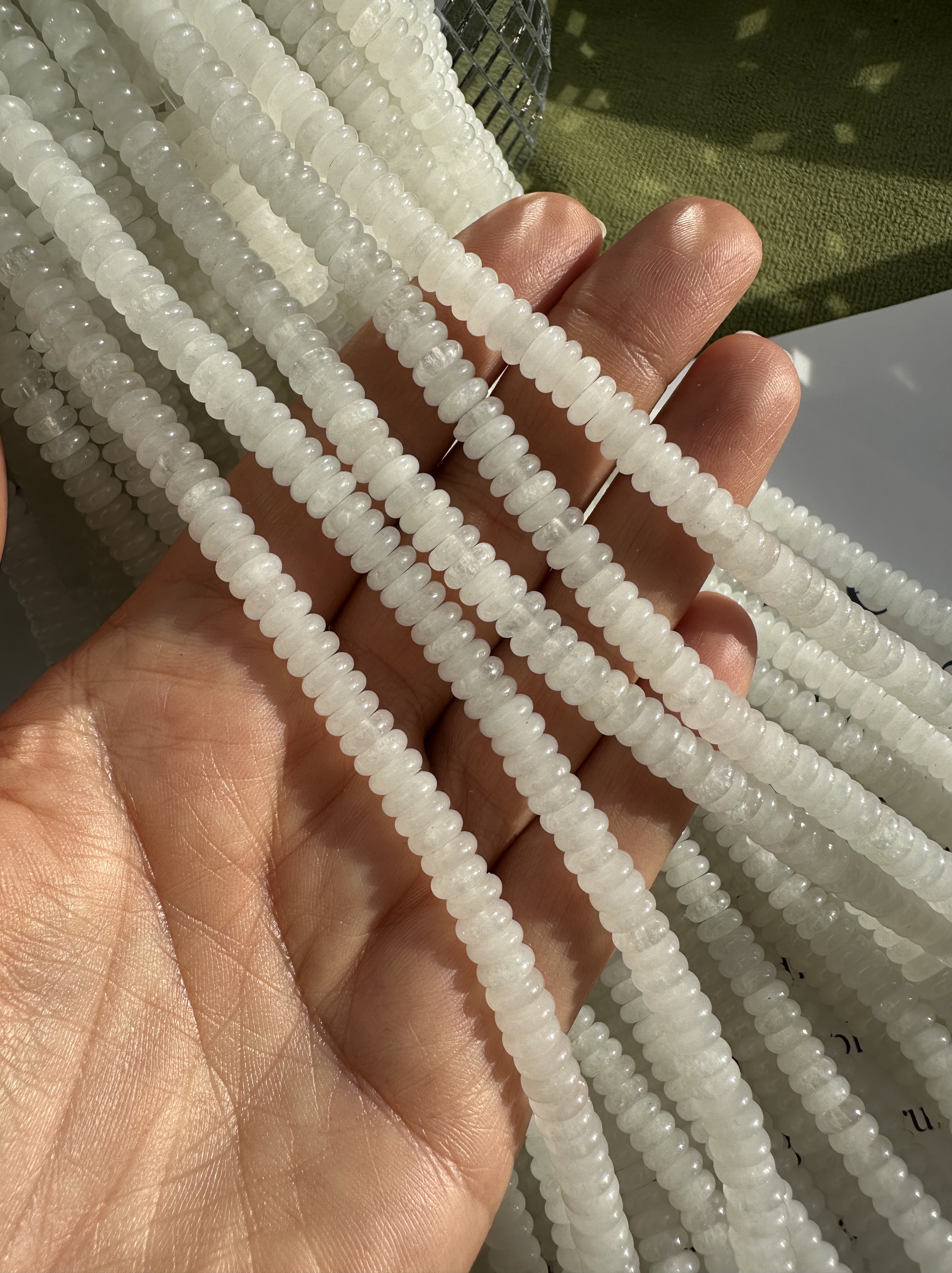 Бусины из белого кварца в форме ронделя могут использоваться для создания любых видов украшений, в том числе идеально подойдут на чокер или браслет. Бусины отлично сочетаются с различными материалами: натуральными каменными бусинами, жемчугом, а также металлическими бусинами золотого и серебряного цвета. Бусины в нитке неоднородны, не одинаковы по размеру, толщине, несущественно отличаются по цвету.
