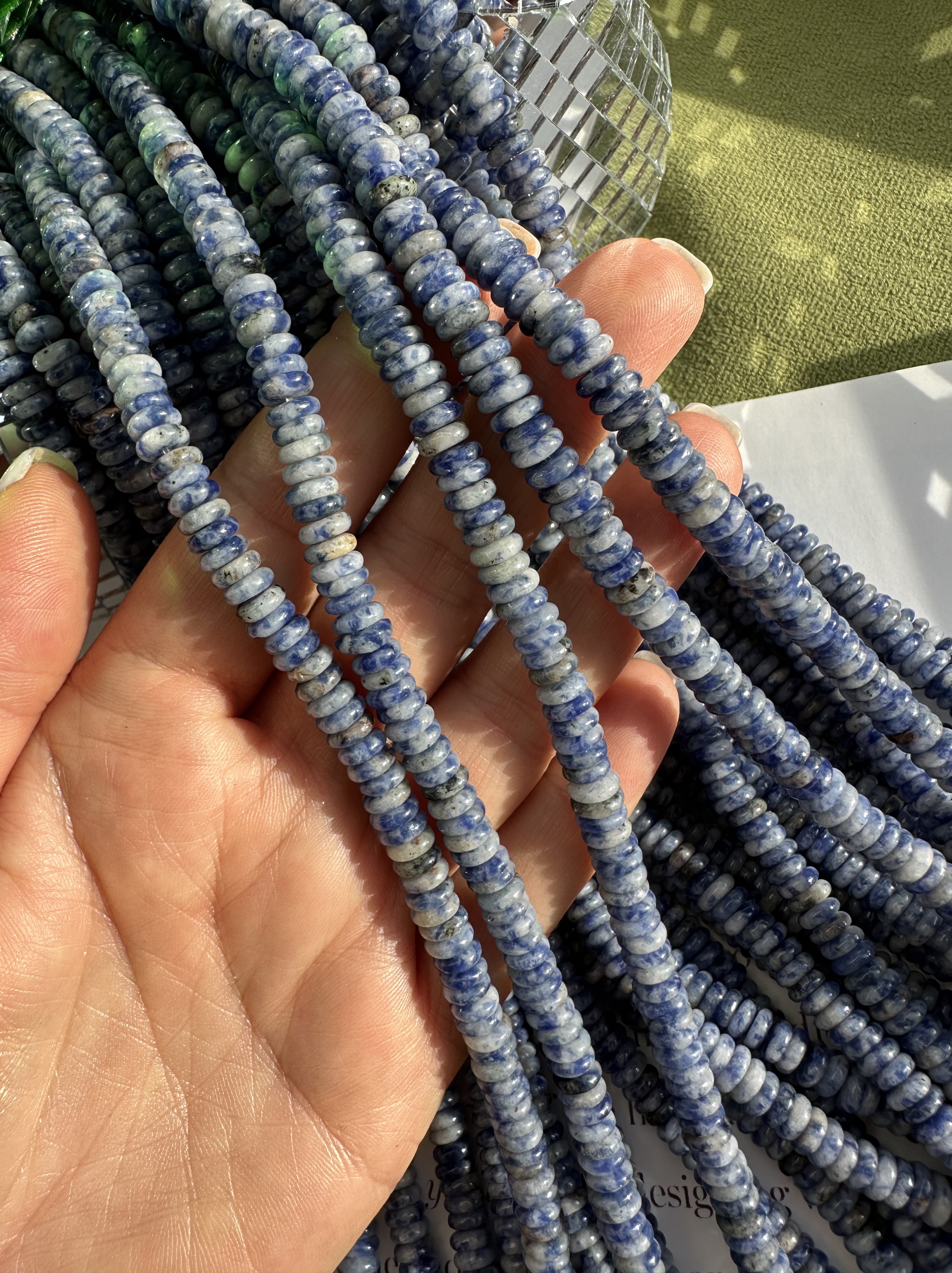 Бусины из содалита в форме ронделя могут использоваться для создания любых видов украшений, в том числе идеально подойдут на чокер или браслет. Бусины отлично сочетаются с различными материалами: натуральным жемчугом, перламутром, а также металлическими бусинами и подвесками. Бусины в нитке неоднородны, не одинаковы по размеру, толщине, отличаются по цвету.