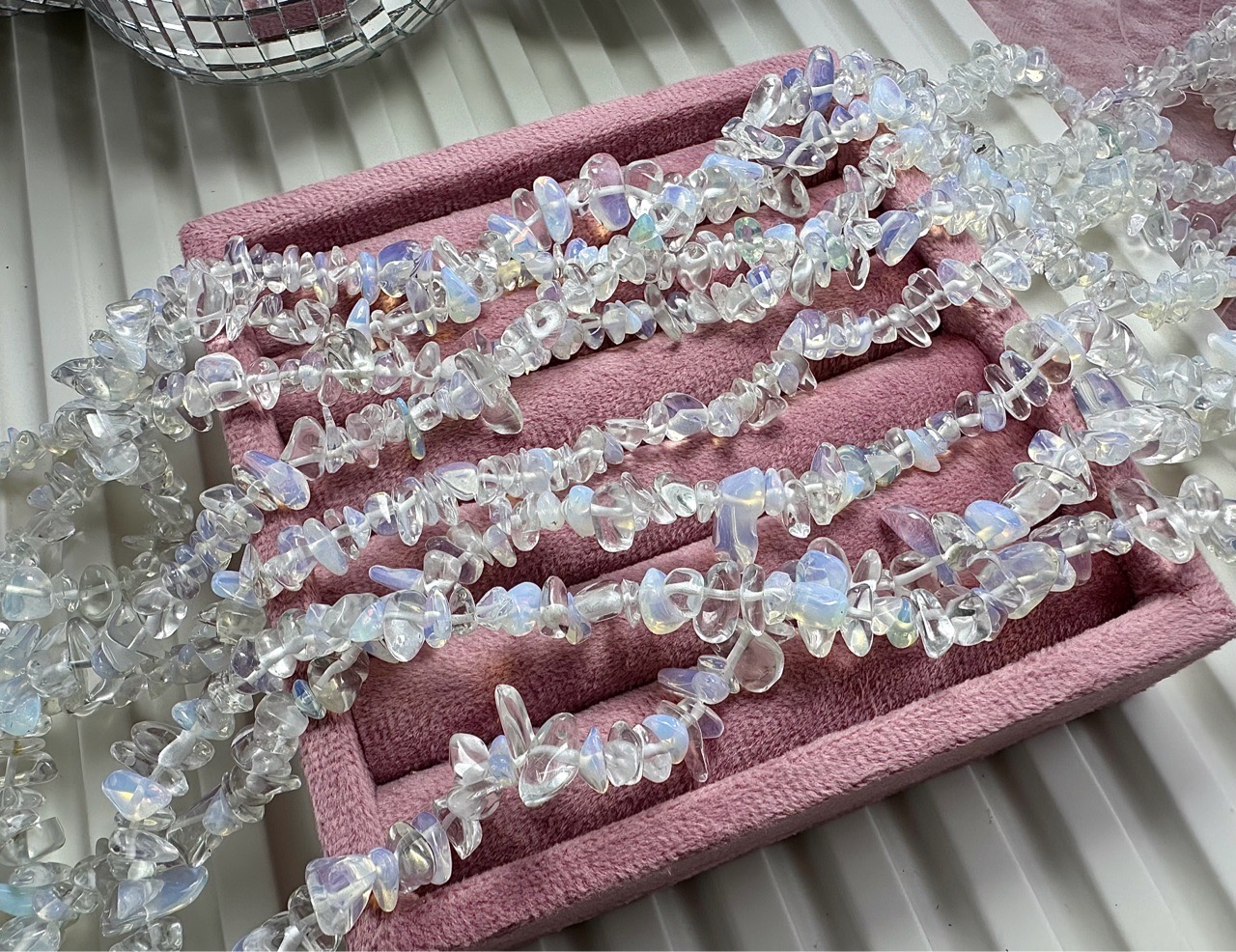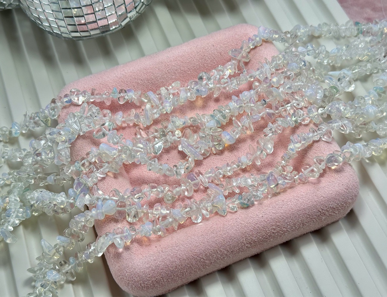 Нить бусин из опалита (имитация опала) свободной формы. Камни в нитке неоднородны, отличаются по цвету и размеру. Возможны вкрапления других камней.