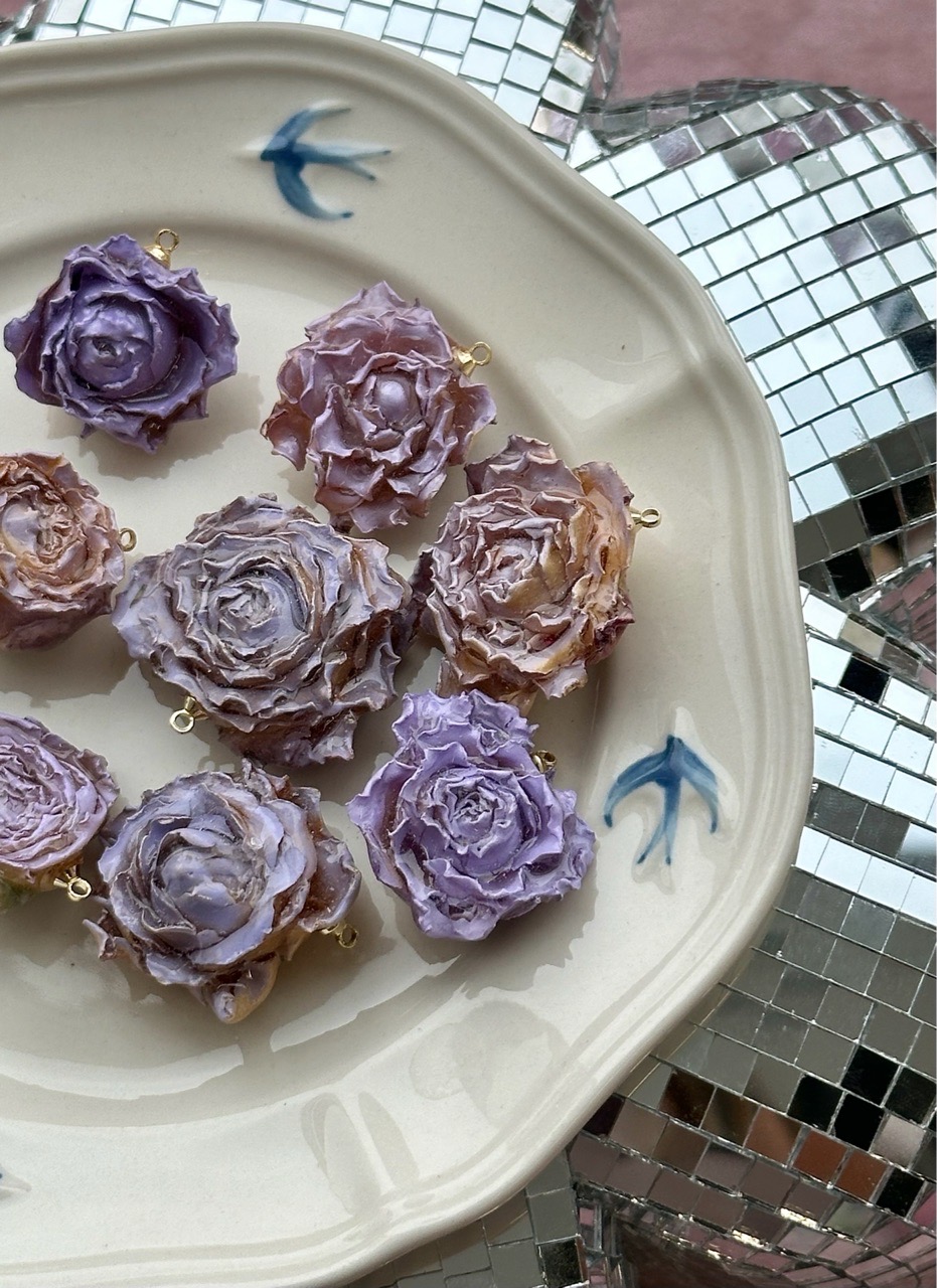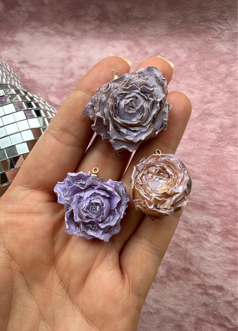 Подвеска ручной работы выполнена из натурального цветка (раскрытый бутон розы), залитого в смолу. Петелька располагается перпендикулярно цветку. Каждая подвеска уникальна.