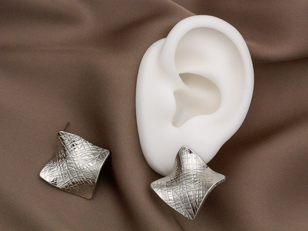 Необычные серьги-гвоздики в форме ромба с эффектом фактурного металла, станут завершающим штрихом в тщательно подобранном образе. Оригинальный дизайн поможет внести изюминку в ваш повседневный гардероб, будь это деловой костюм или базовый лук, подчеркнув ваш вкус и женственность.