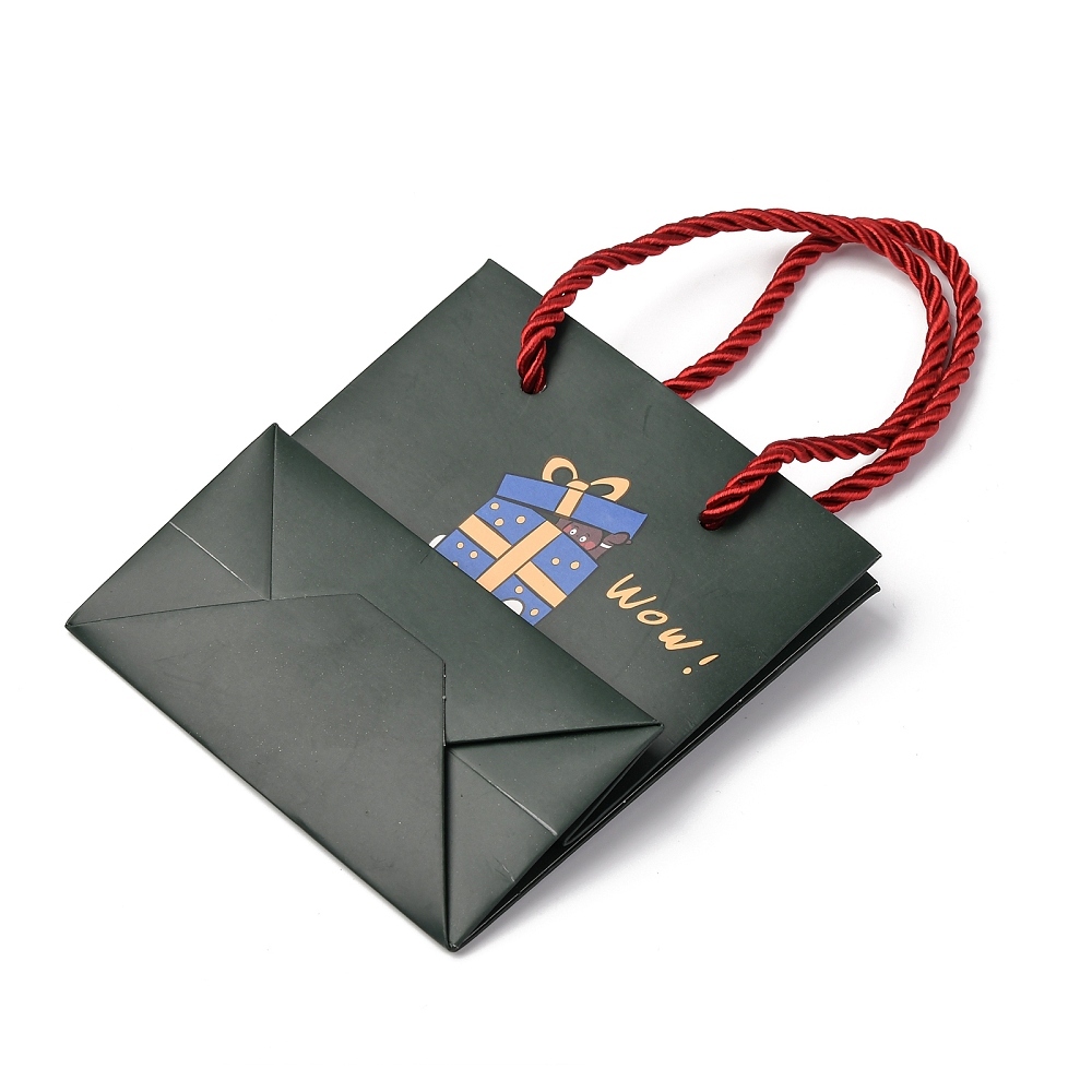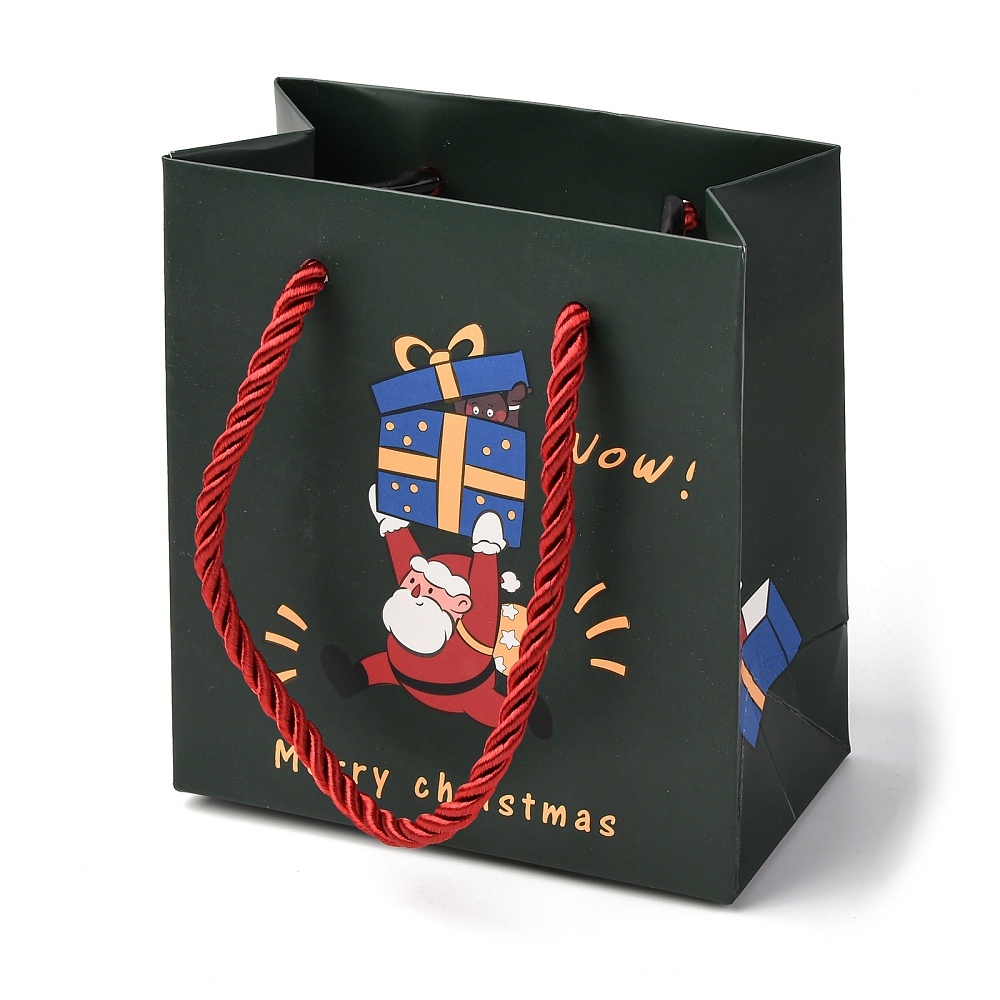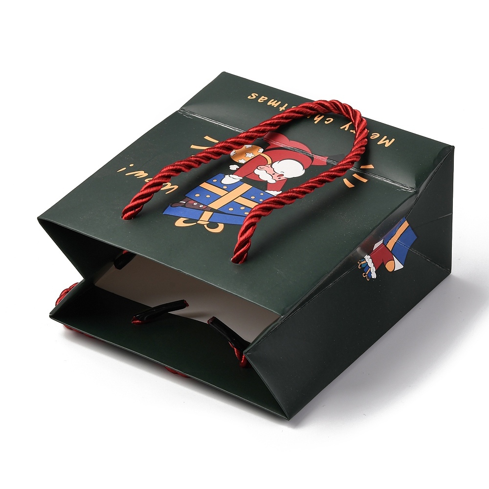 Плотный бумажный пакет с кручеными ручками и новогодним принтом для упаковки подарков. Хорошо склеены дно и боковины. Дно прямоугольное.