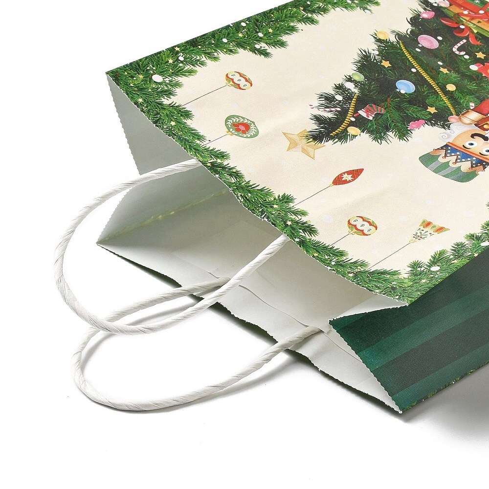 Неплотный бумажный пакет с кручеными ручками и новогодним принтом для упаковки подарков. Хорошо склеены дно и боковины. Дно прямоугольное.