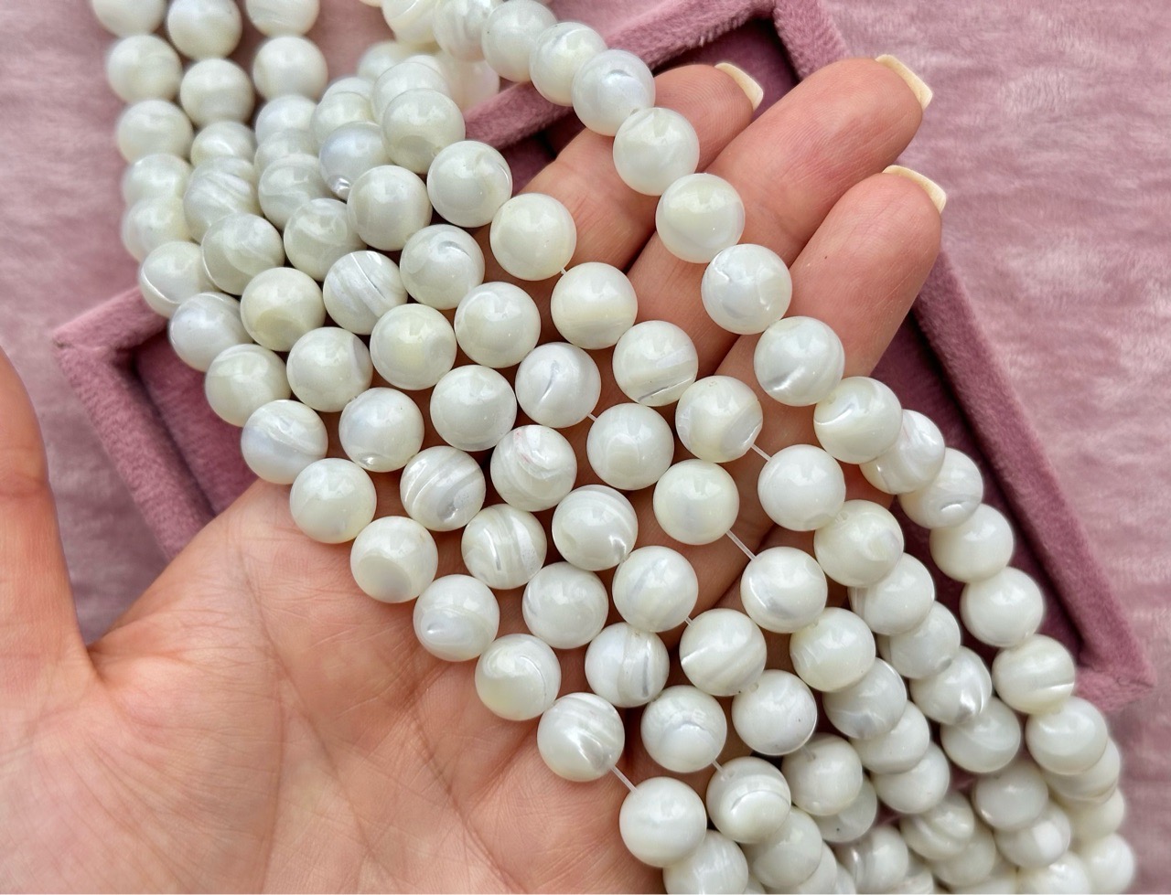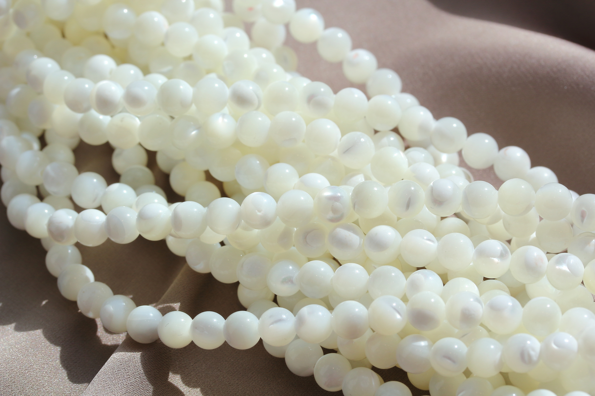 Бусины из натурального перламутра гладкие, круглые могут использоваться для создания любых видов украшений, в том числе идеально подойдут на чокер, браслет, серьги. Бусины в нитке неоднородны, могут несущественно отличаться по цвету и размеру.