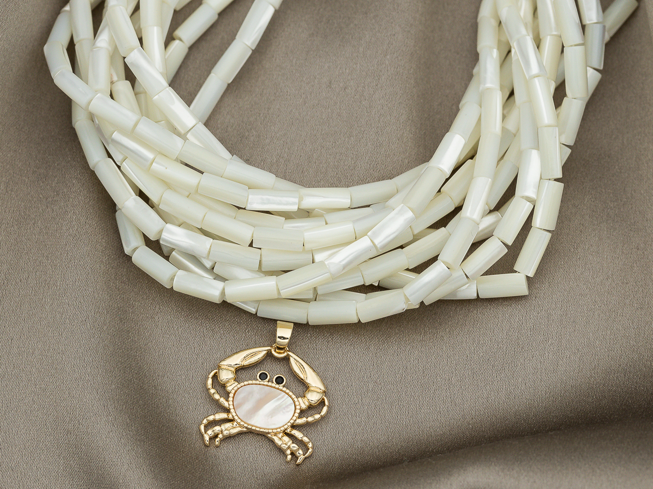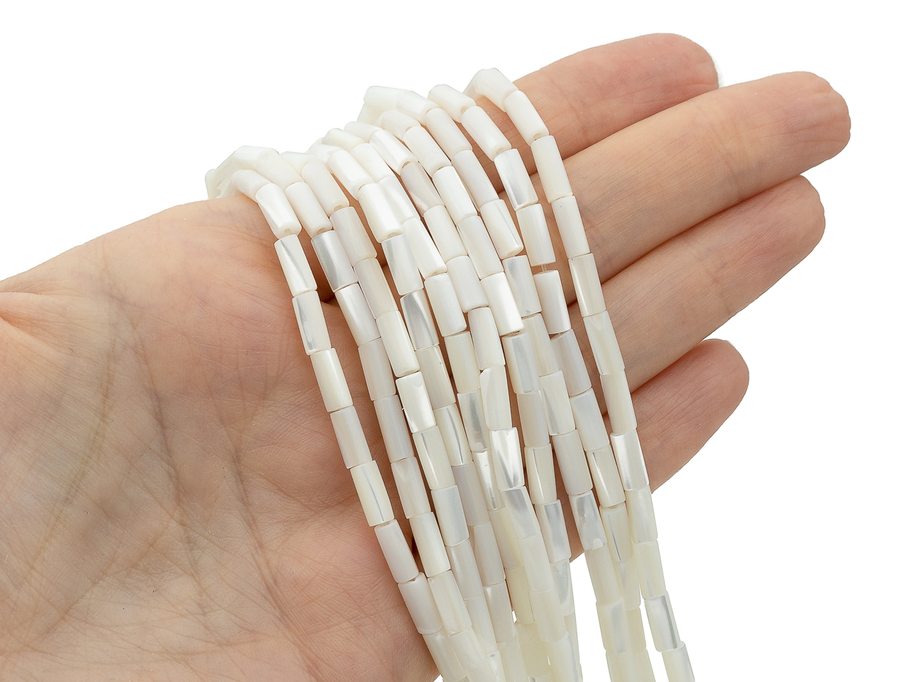 Нить бусин в форме небольших трубочек из натурального перламутра.