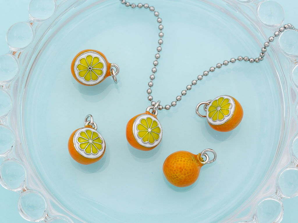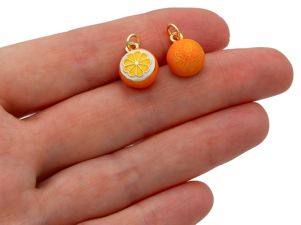 Небольшая, оригинальная подвеска в форме разрезанного апельсина с аппетитными дольками станет настоящей находкой для любителей эксклюзивных украшений. Подвеска отлично подойдет для создания любых украшений: серьги, кольцо, чокер, колье. Эффектный аксессуар поможет создать вам модный и интересный образ.