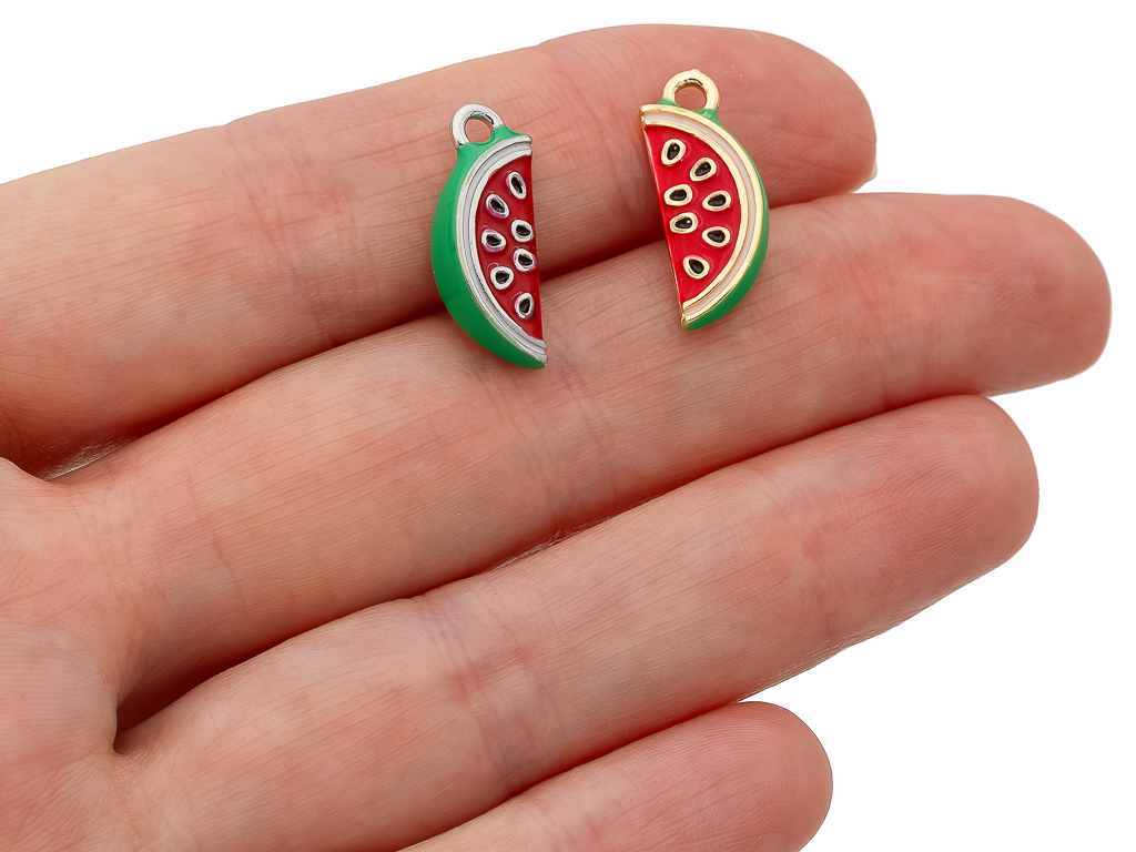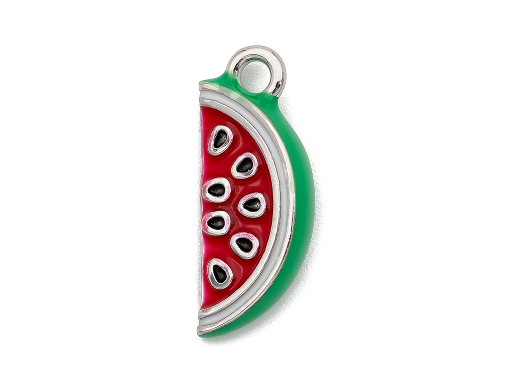 Яркая подвеска в форме дольки спелого арбуза, покрытая эмалью, станет настоящей находкой для любителей эксклюзивных украшений. Отлично подойдет для создания чокеров, колье, сережек.