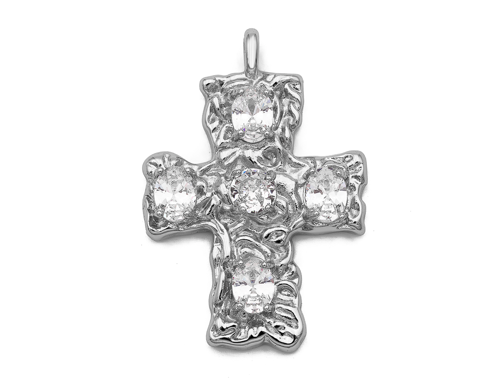 Крупная акцентная подвеска из мятого металла в форме креста, украшенного кристаллами ювелирной огранки, хорошо будет смотреться на колье из крупных цепей или камней. Данная подвеска подойдет как для повседневного, так и для вечернего образа.