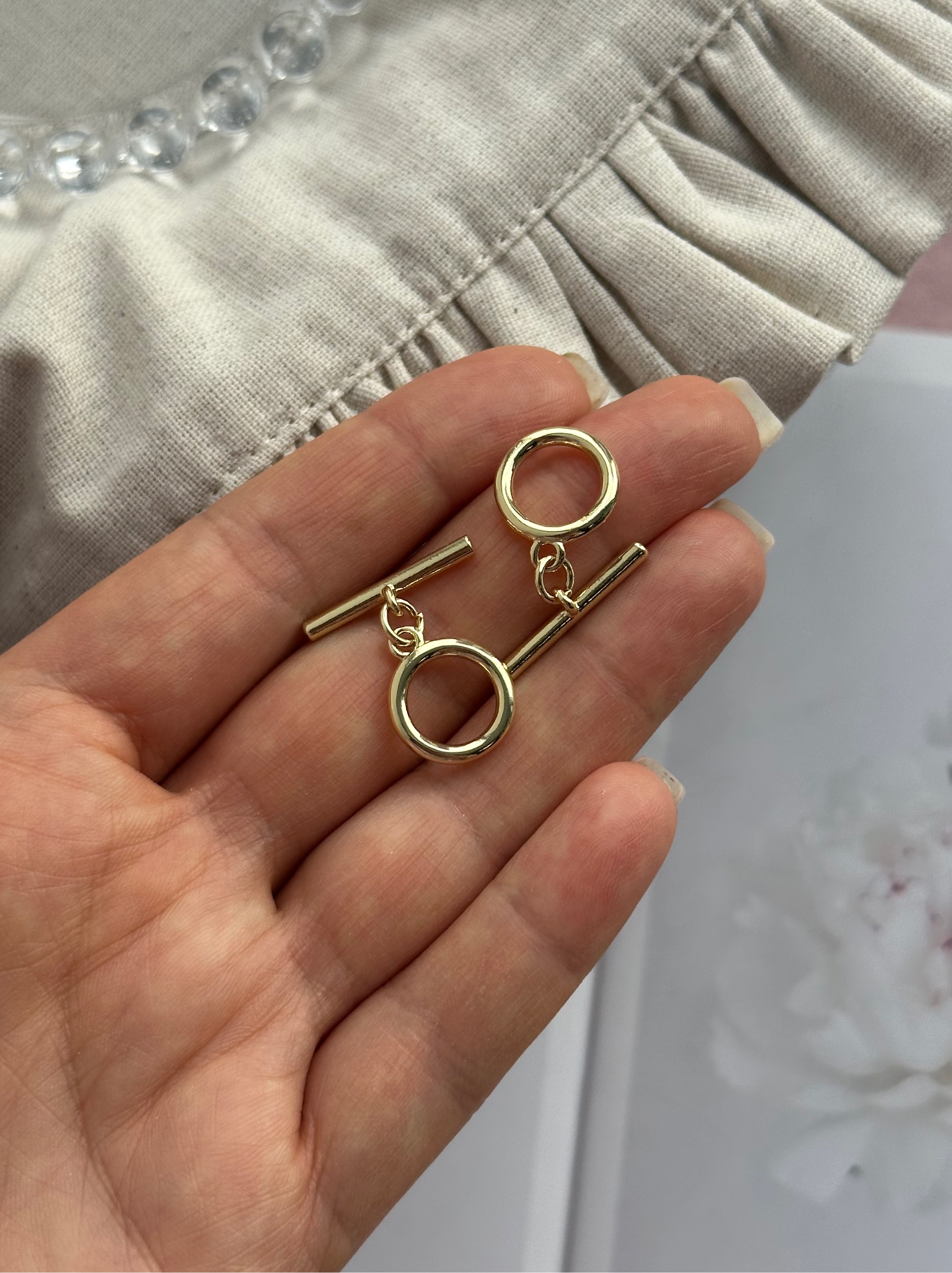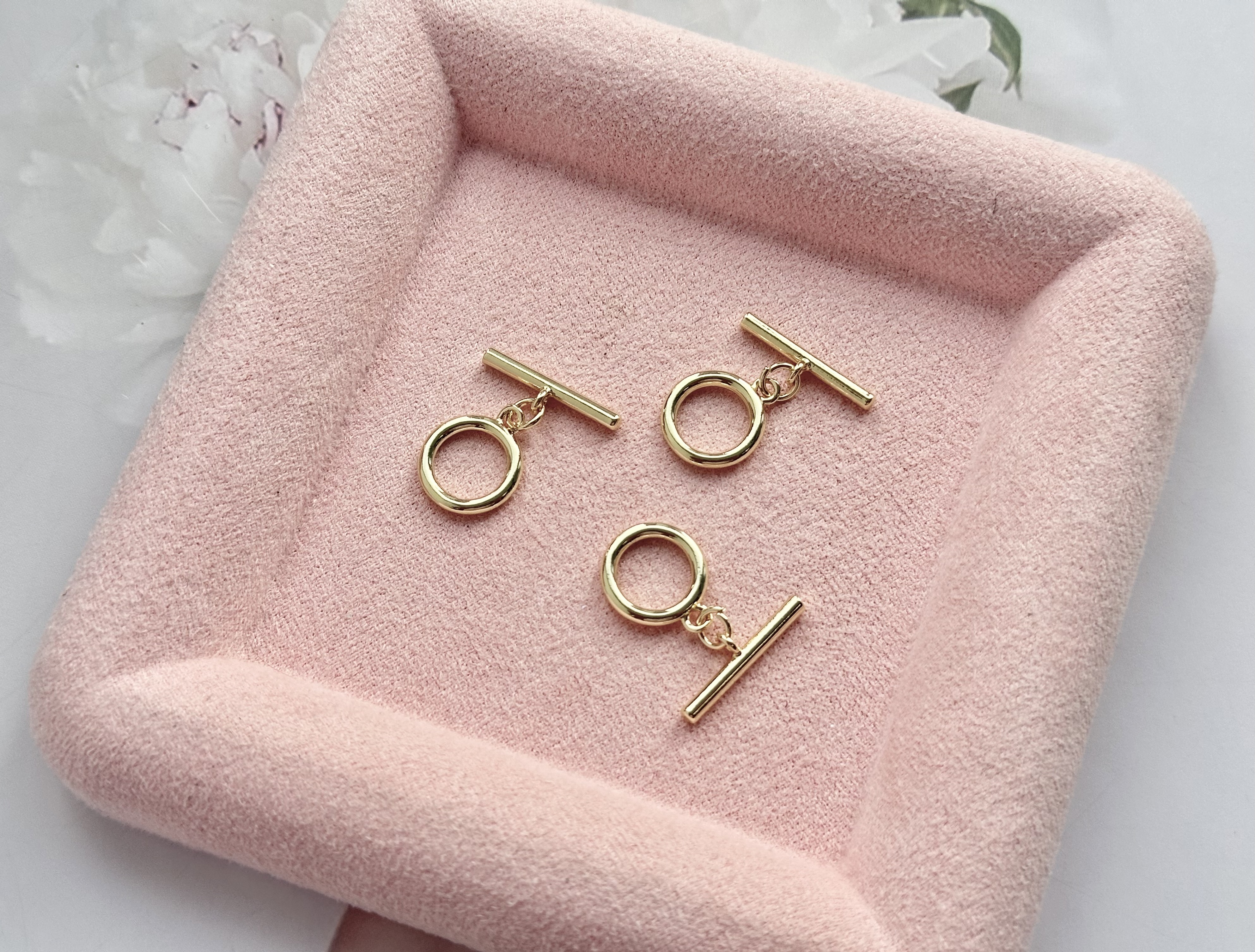 Тогл-замок для бижутерии представляет собой два элемента: один из которых имеет круглое или фигурное отверстие, через которое продевается другой элемент в виде стержня и фиксируется благодаря разнице размеров стержня и диаметра отверстия.